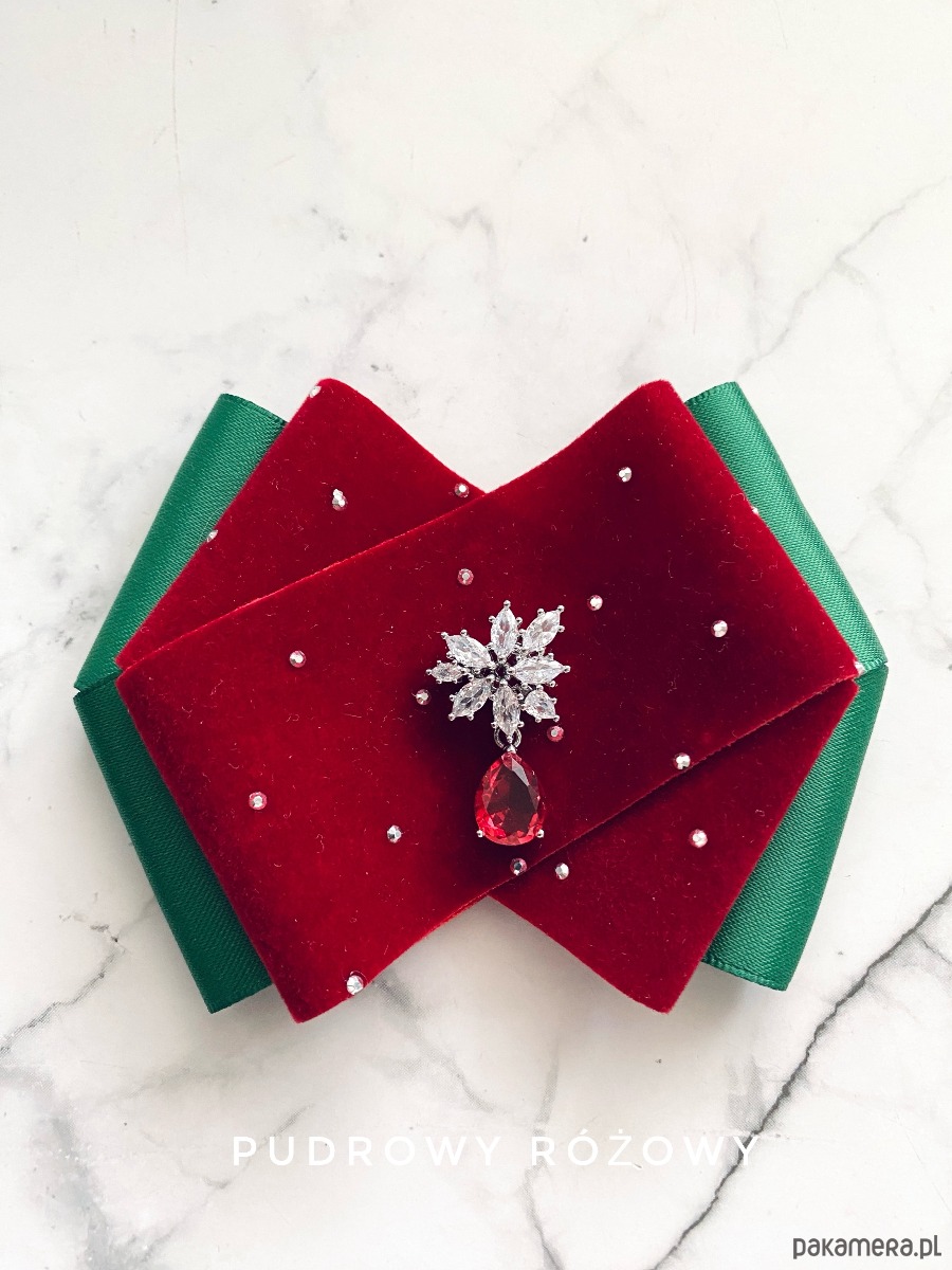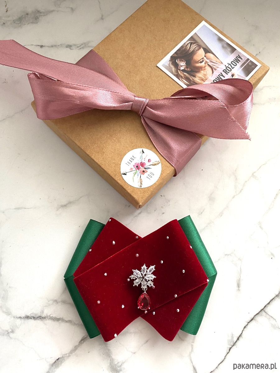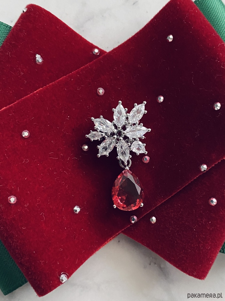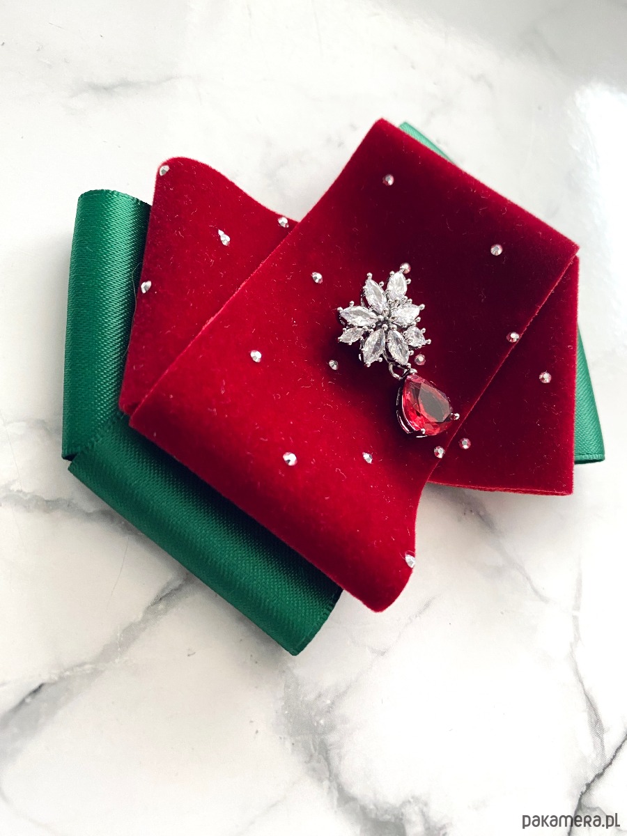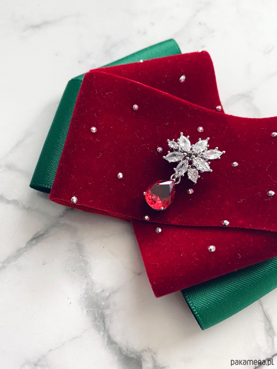 Brosza z dodatkiem wstążki wykonanej z aksamitu z drobnymi mieniącymi kryształkami. Do tego delikatna ozdoba biżuteryjna. Duet idealny!