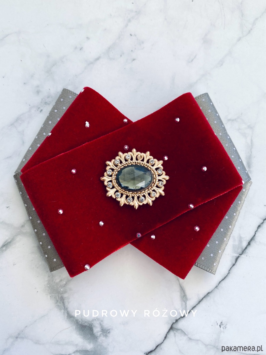 Brosza z dodatkiem wstążki wykonanej z aksamitu z drobnymi mieniącymi kryształkami. Do tego delikatna ozdoba biżuteryjna. Duet idealny!