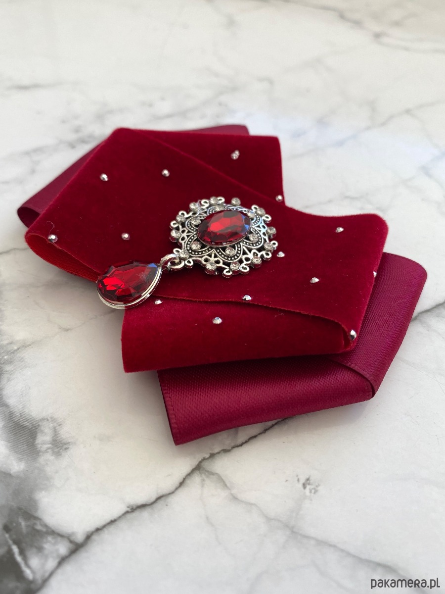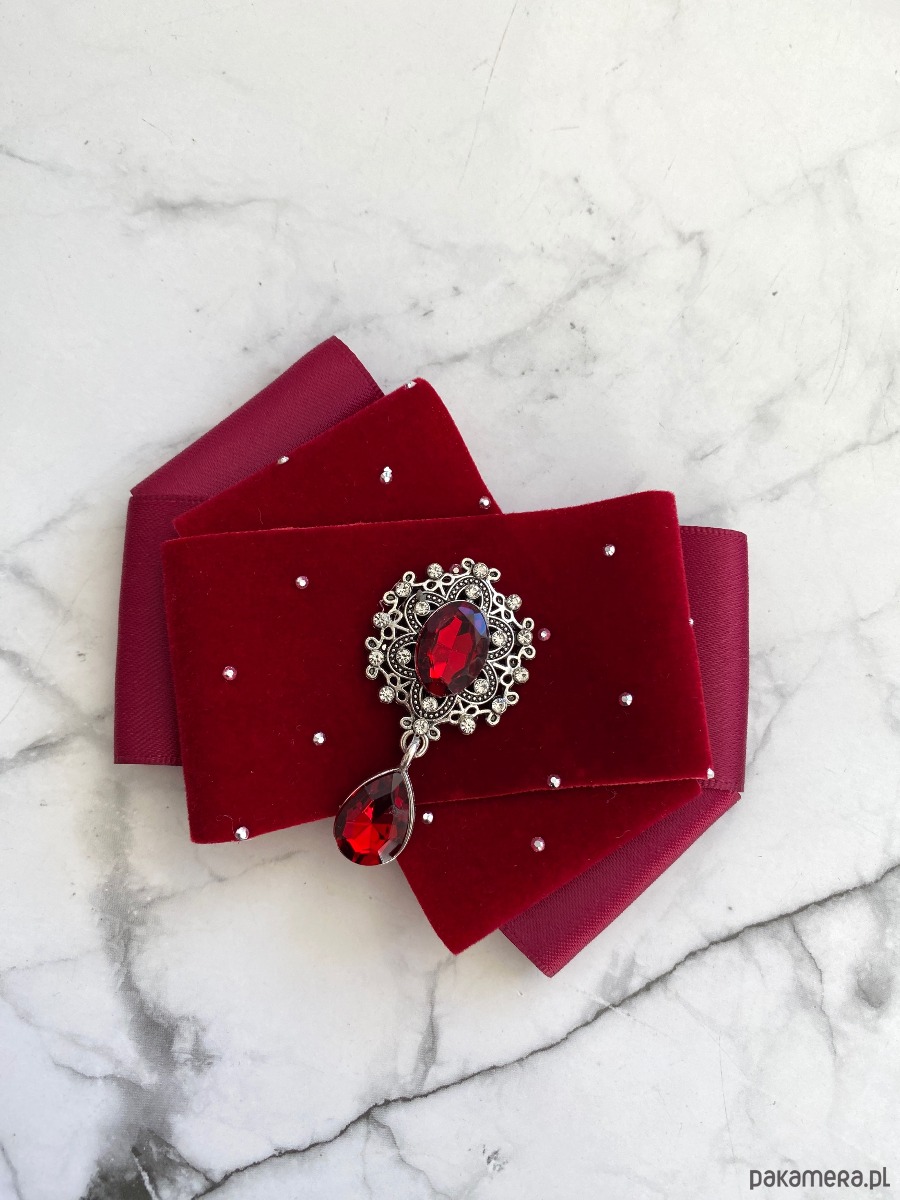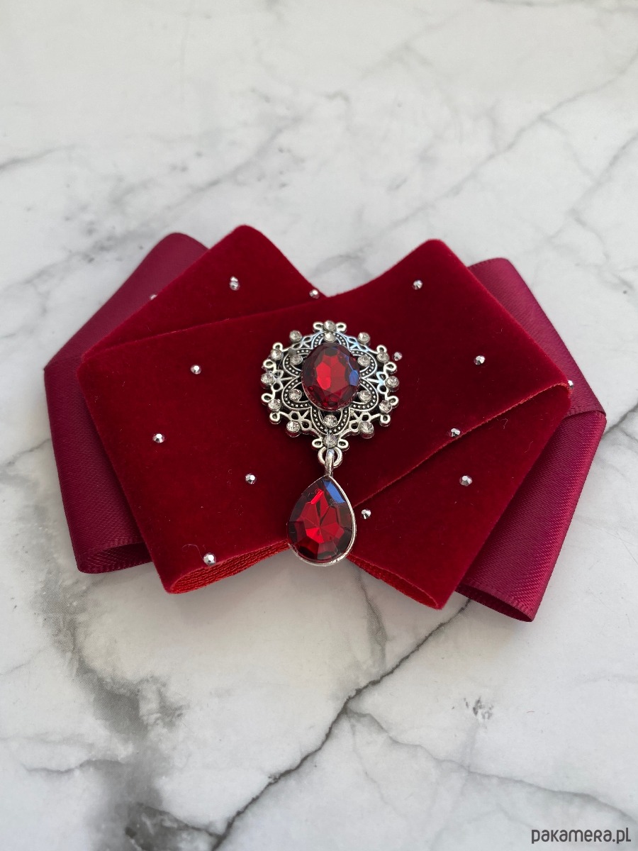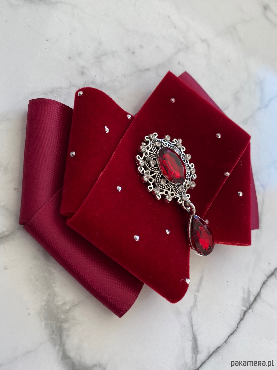 Brosza z dodatkiem wstążki wykonanej z aksamitu z drobnymi mieniącymi kryształkami. Do tego delikatna ozdoba biżuteryjna. Duet idealny!