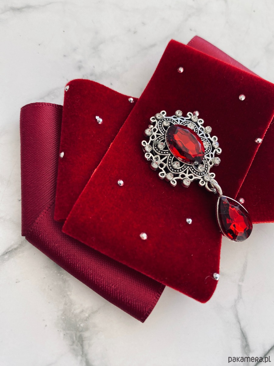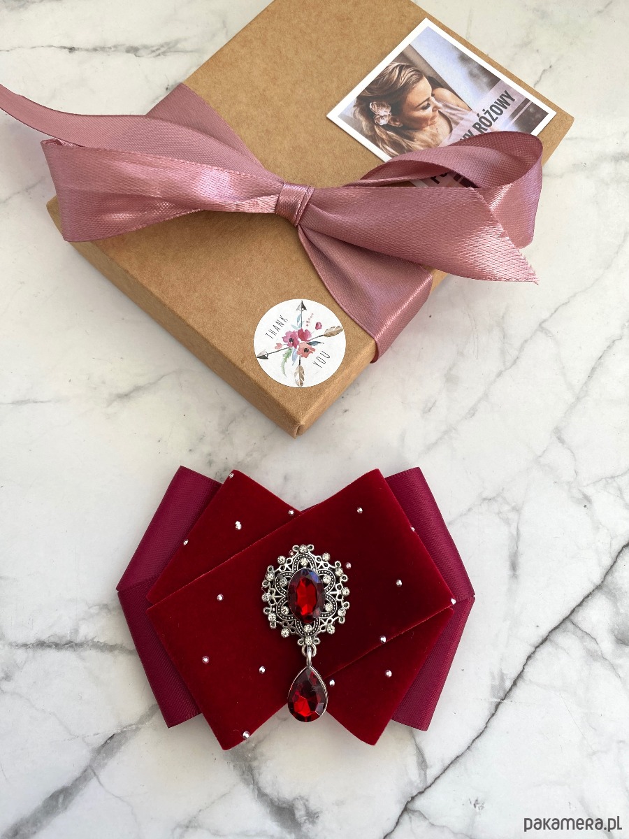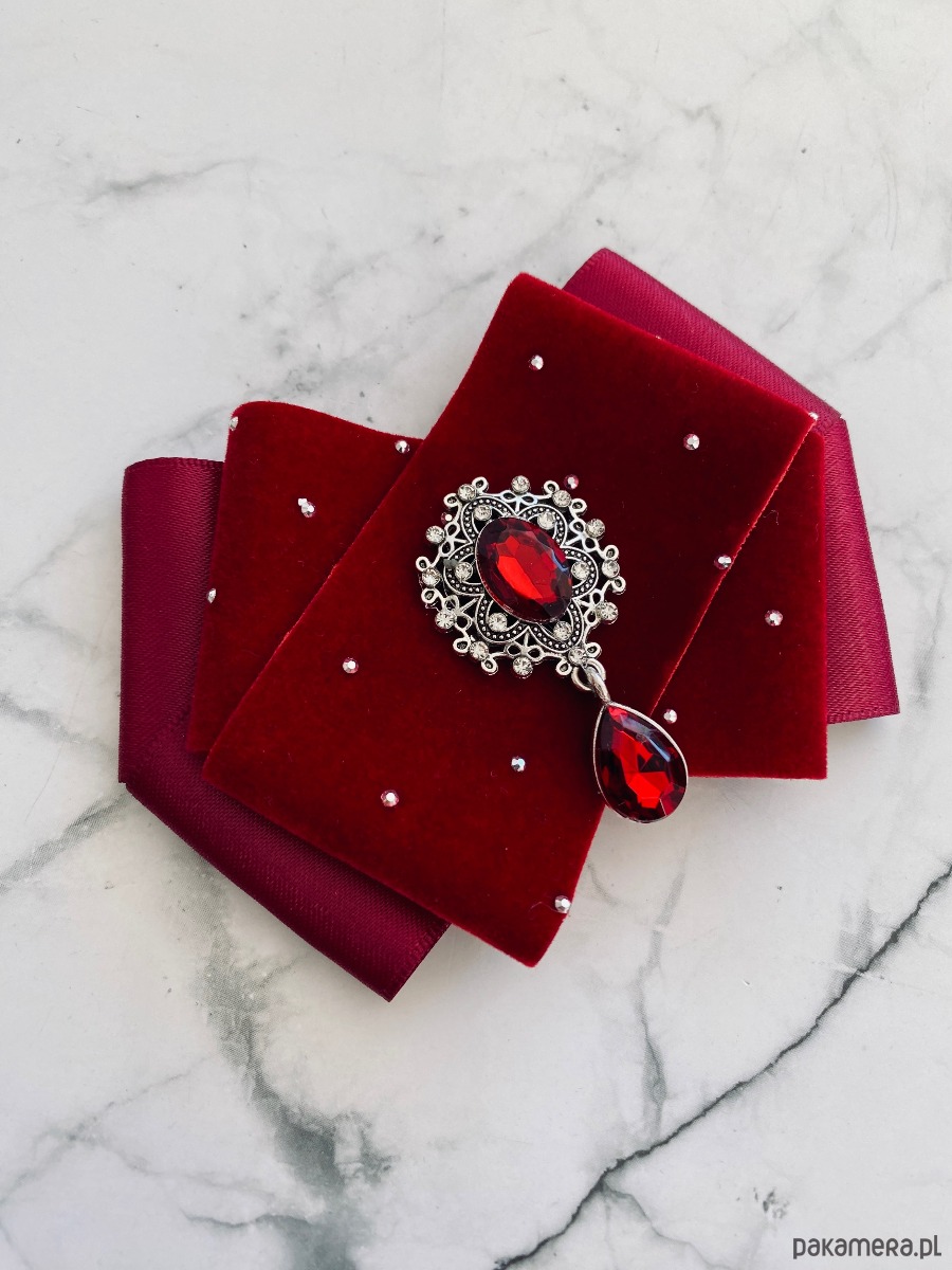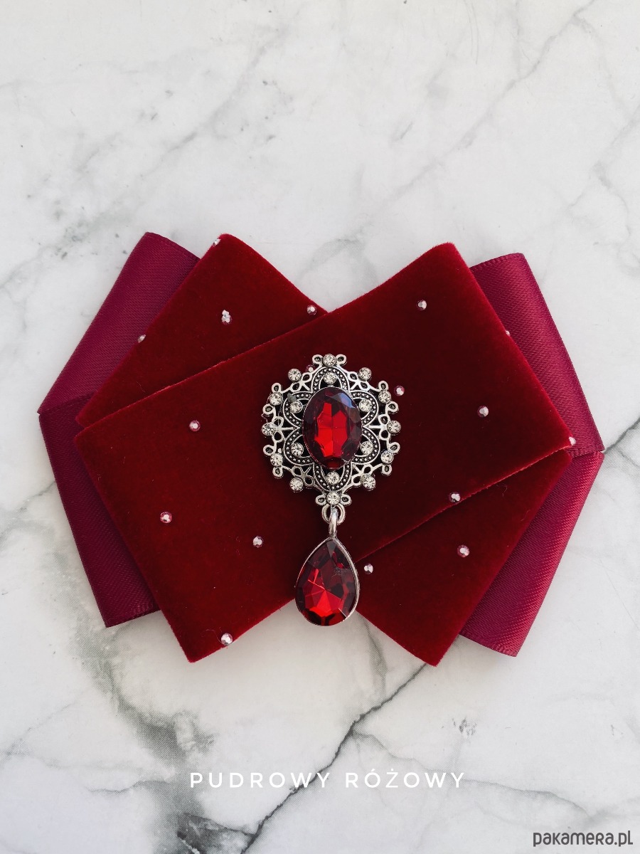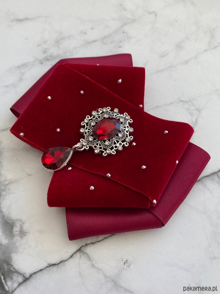 Brosza z dodatkiem wstążki wykonanej z aksamitu z drobnymi mieniącymi kryształkami. Do tego delikatna ozdoba biżuteryjna. Duet idealny!