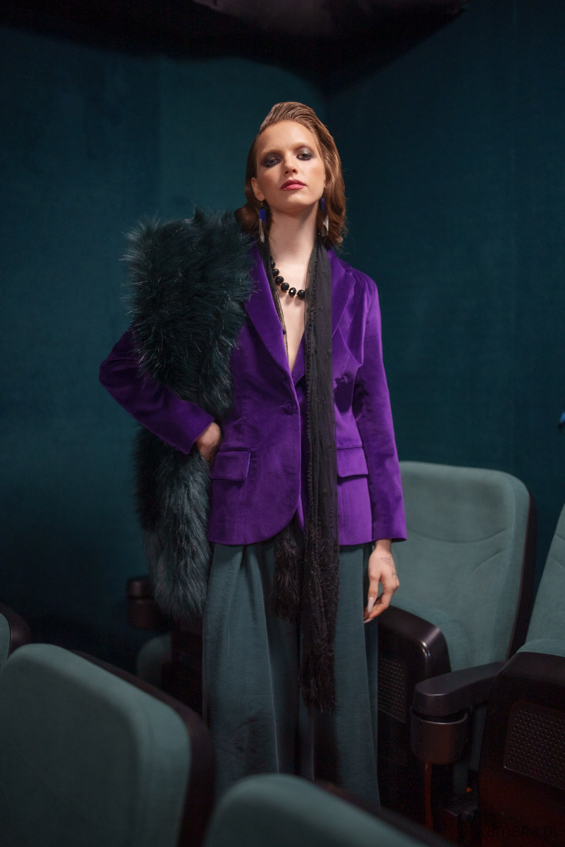 Zalecamy pranie chemiczne, aby zachować piękno i teksturę aksamitnego materiału. Przechowuj marynarkę w suchym miejscu, aby uniknąć uszkodzeń.