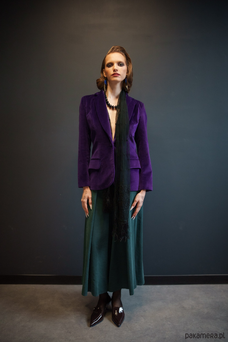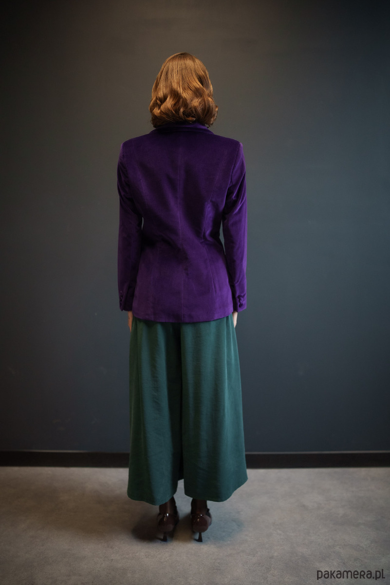 Detale: Subtelne przeszycia oraz eleganckie klapy, które podkreślają sylwetkę i dodają elegancji. Guziki również wykończone aksamitem.