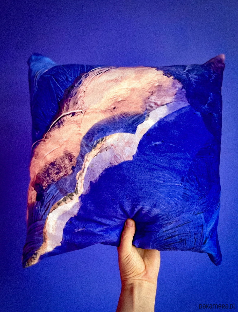 Dekoracyjna poduszka uszyta z aksamitu w ręcznie malowany wzór KOBALTOWE CHMURY na niebie
