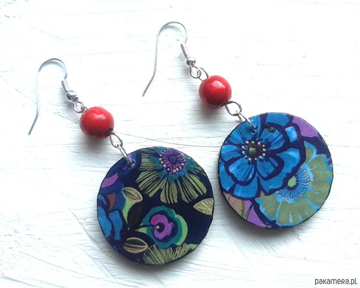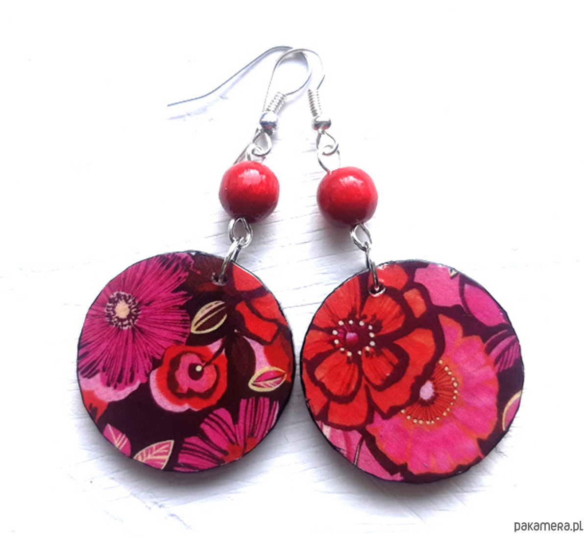 kolczyki drewniane, ozdobione metodą decoupage, dwustronne, starannie wykończone farbami akrylowymi i zabezpieczone wielokrotnie lakierem, koraliki drewniane, bigle posrebrzane, długość kolczyków bez bigli: 5 cm, średnica: 3 cm, bardzo lekkie