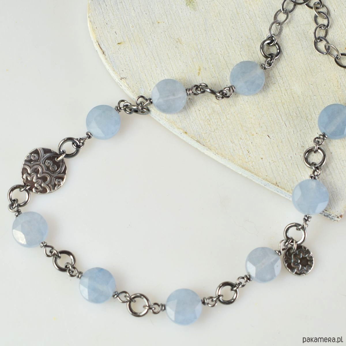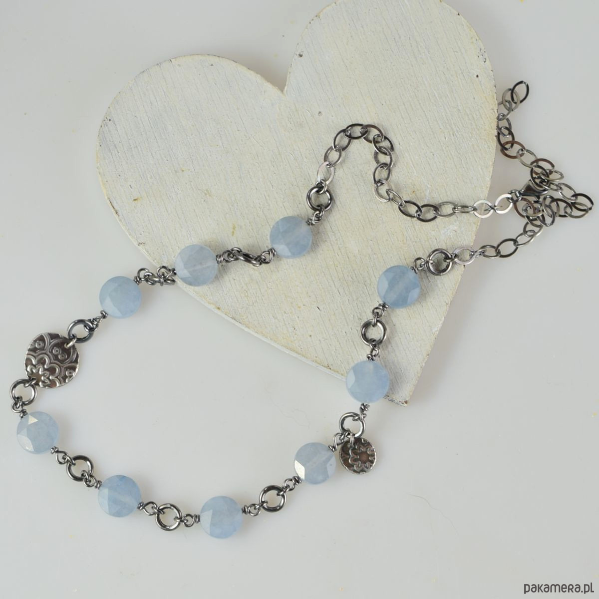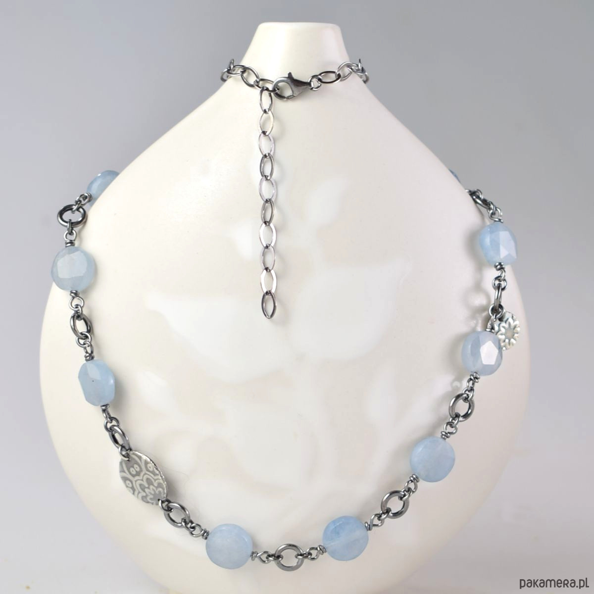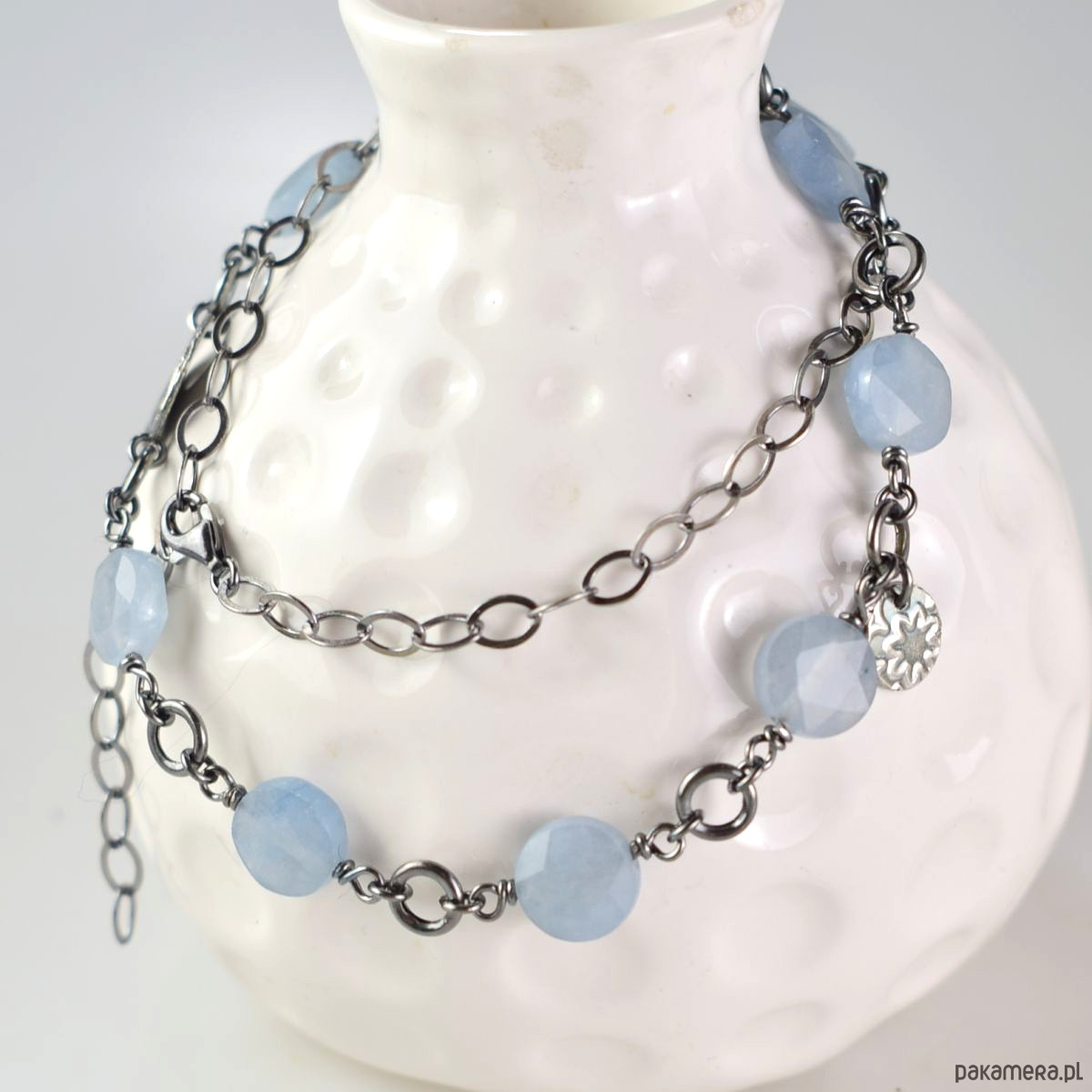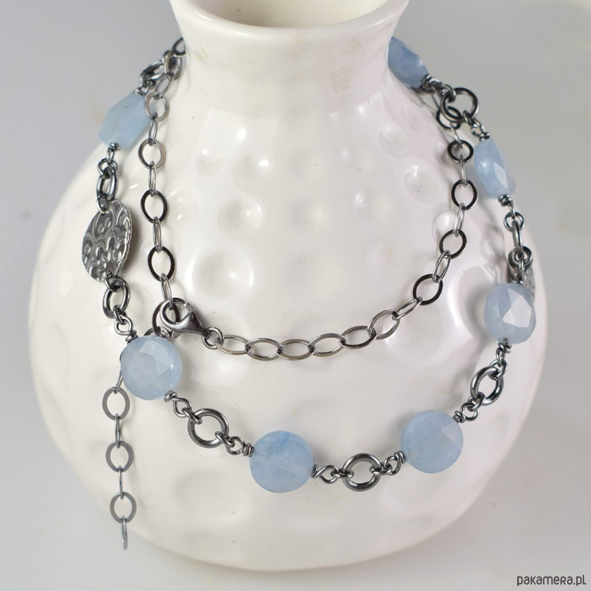 Naszyjnik wykonany w całości ze srebra (próba 925) oraz akwamarynu. Biżuteria została zoksydowana (przyciemniona) i wypolerowana. Długość całkowita 49 cm, średnica kamieni 10 mm. Biżuteria zostanie ozdobnie zapakowana.