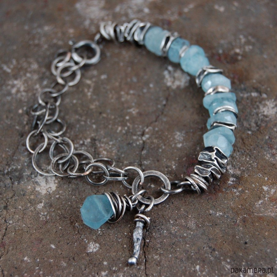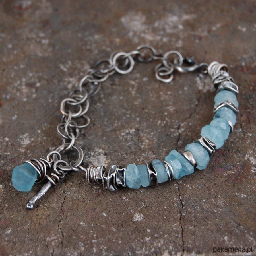 Bransoleta ze srebra i nieregularnych bryłek akwamarynów. Srebro oksydowane. Wielkość kamieni ok. 0,8 - 1 cm, Obwód nadgarstka 15 cm.