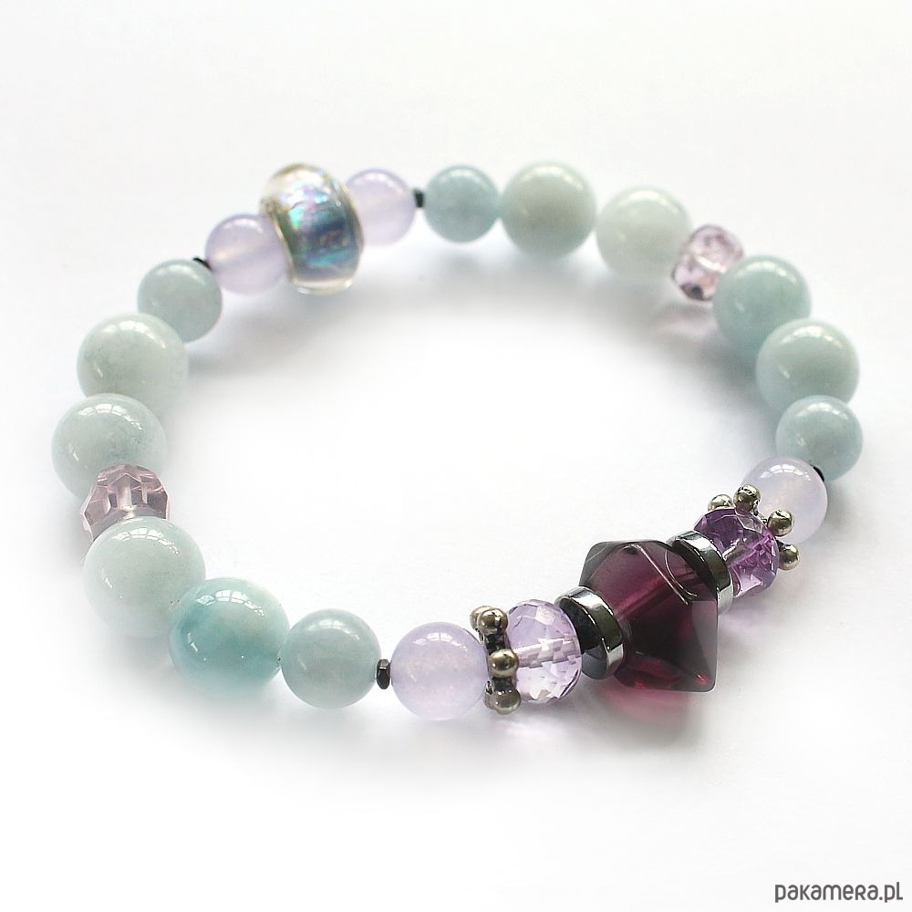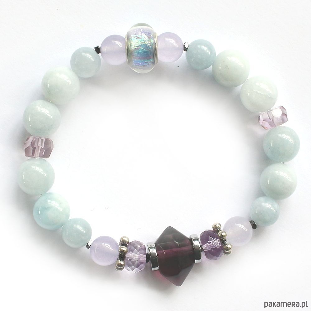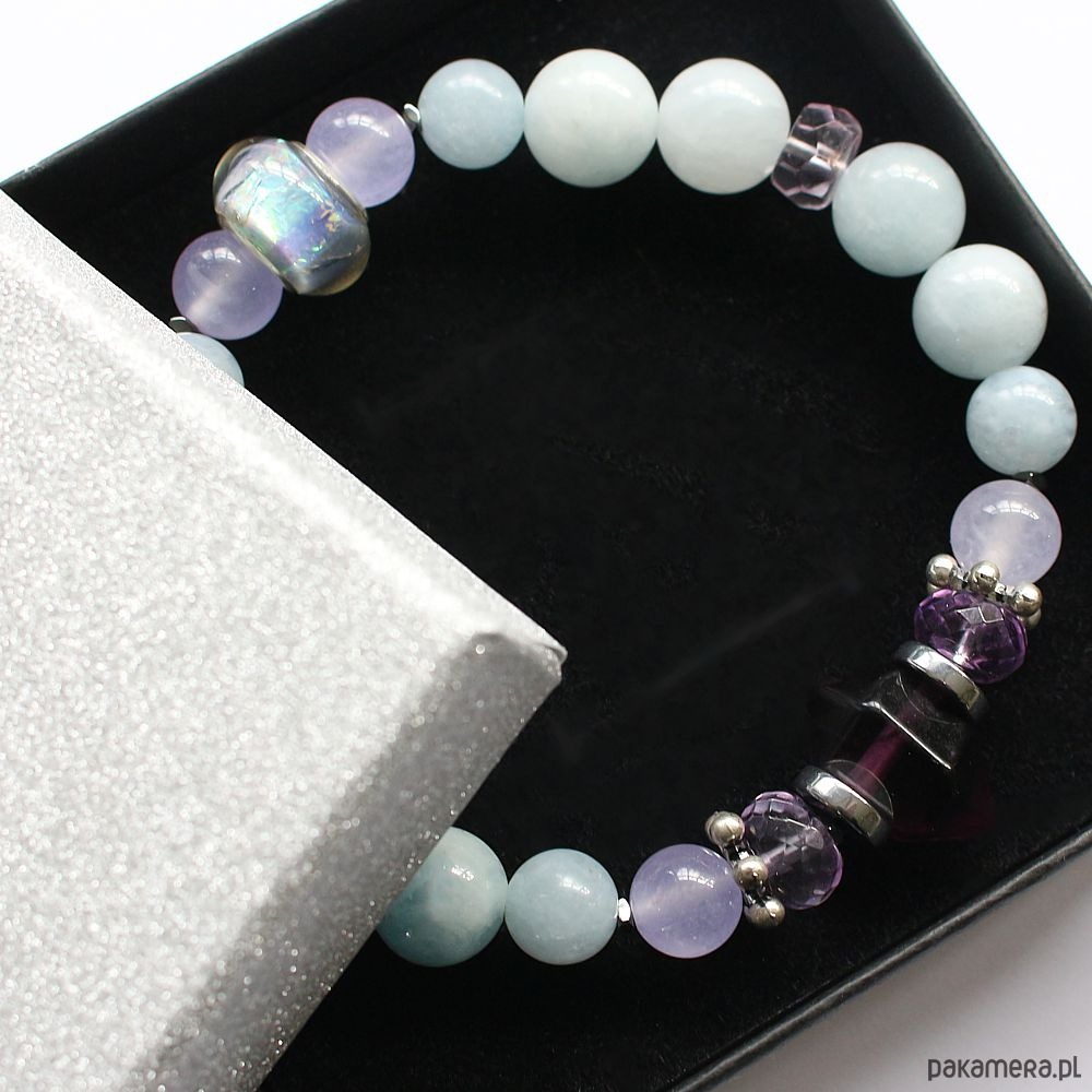 Energetyczna bransoletka z akwamarynem, fluorytowym mini obeliskiem, fasetowanym ametrynem, chalcedonem, hematytami i efektowną przekładką z holograficznym koralikiem Pandora.