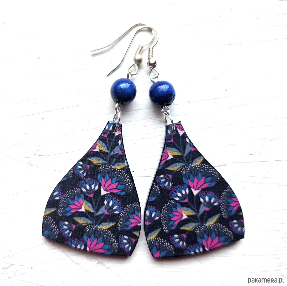 kolczyki drewniane, ozdobione metodą decoupage, dwustronne, starannie wykończone farbami akrylowymi i zabezpieczone wielokrotnie lakierem, koraliki drewniane, bigle posrebrzane, długość kolczyków bez bigli: 6 cm, szerokość: 3 cm, bardzo lekkie