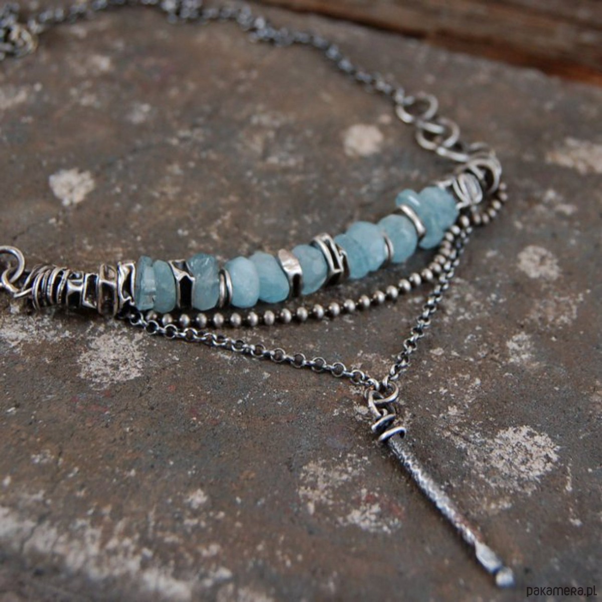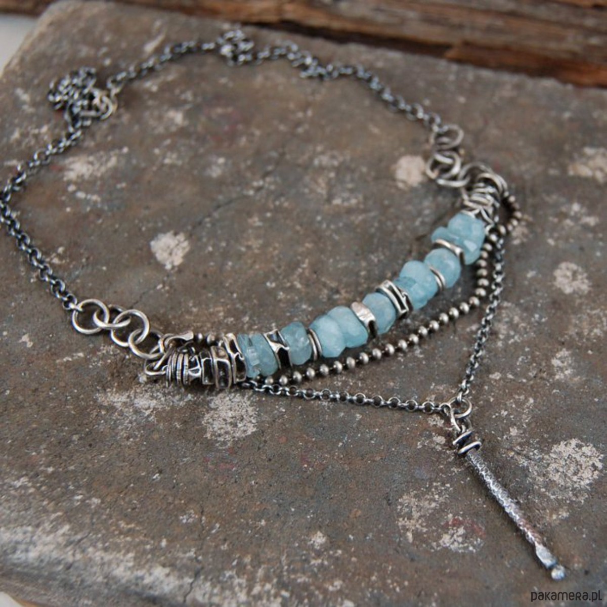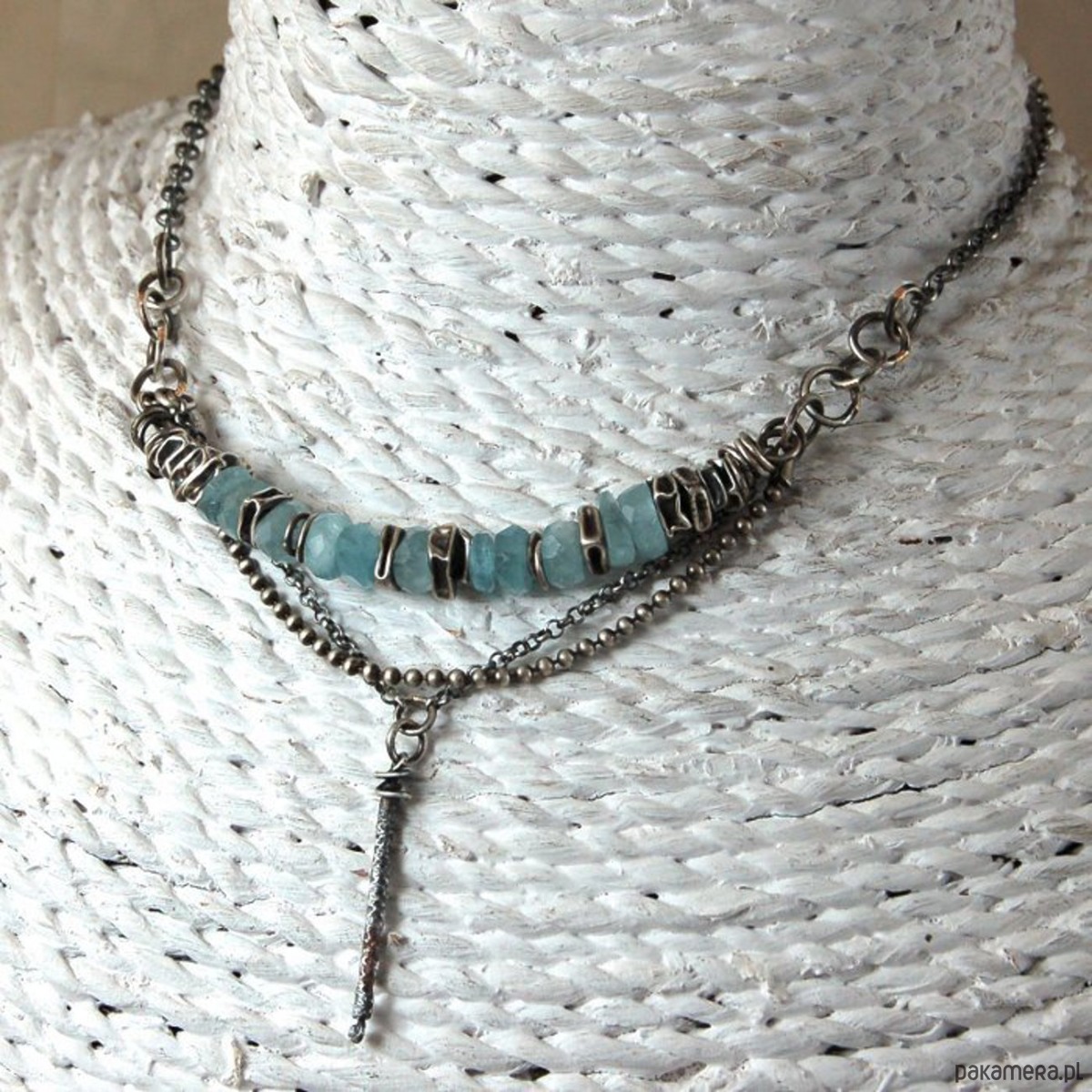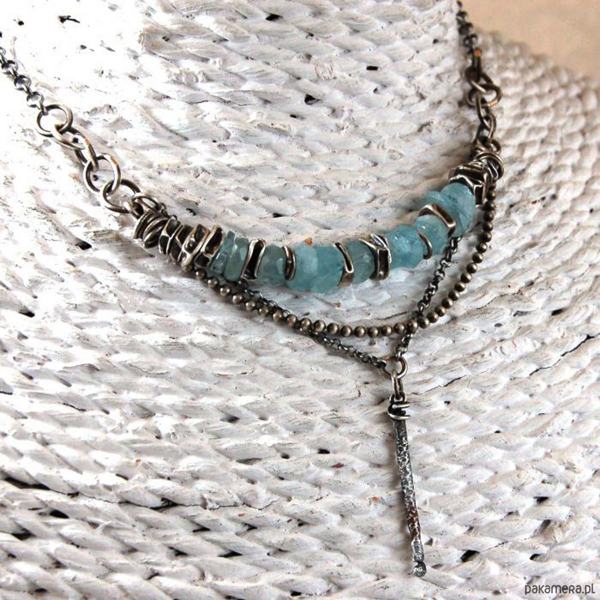 Naszyjnik ze srebra i nieregularnych bryłek akwamarynów. Srebro oksydowane. Wielkość kamieni ok. 0,8 - 1 cm, długość naszyjnika 45 cm.