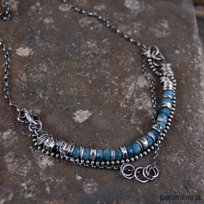 Naszyjnik ze srebra i akwamarynów. Srebro oksydowane. Wielkość kamieni 0,6 cm, długość naszyjnika 44 - 46 cm.