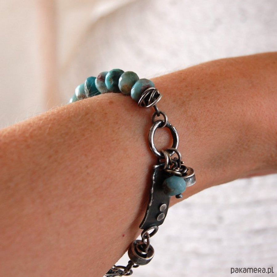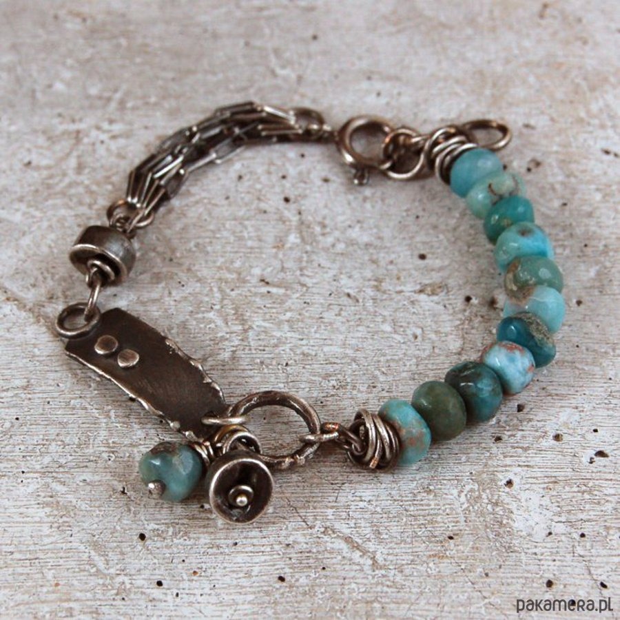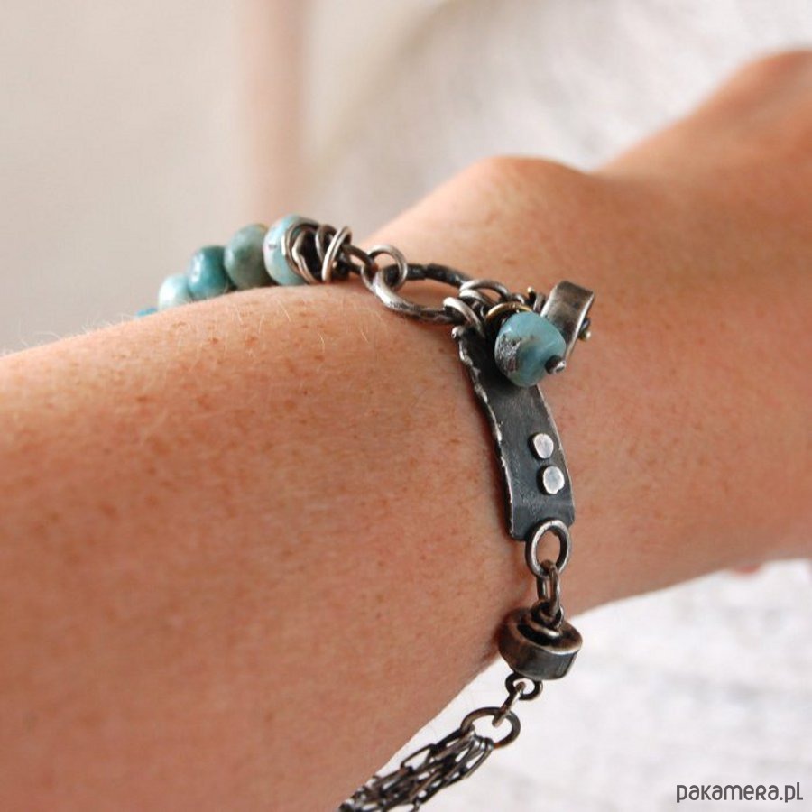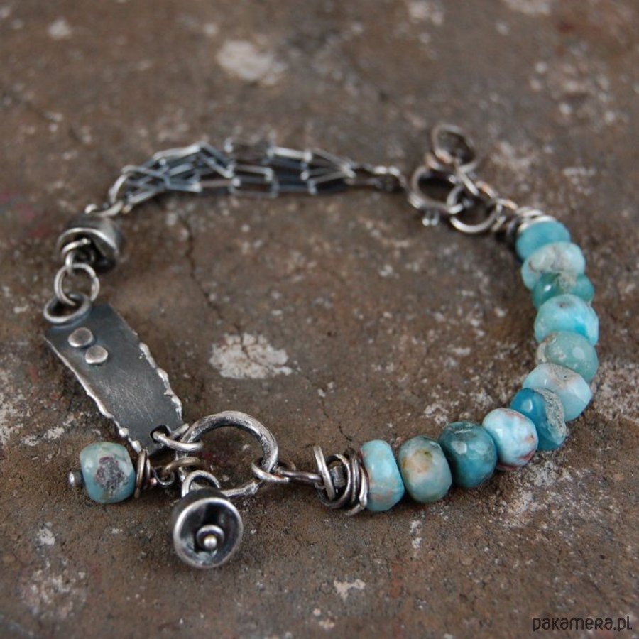 Bransoleta ze srebra i larimaru. Srebro oksydowane. Średnica kamieni 0,7 - 0,8 cm, obwód bransolety 17 - 18 cm.