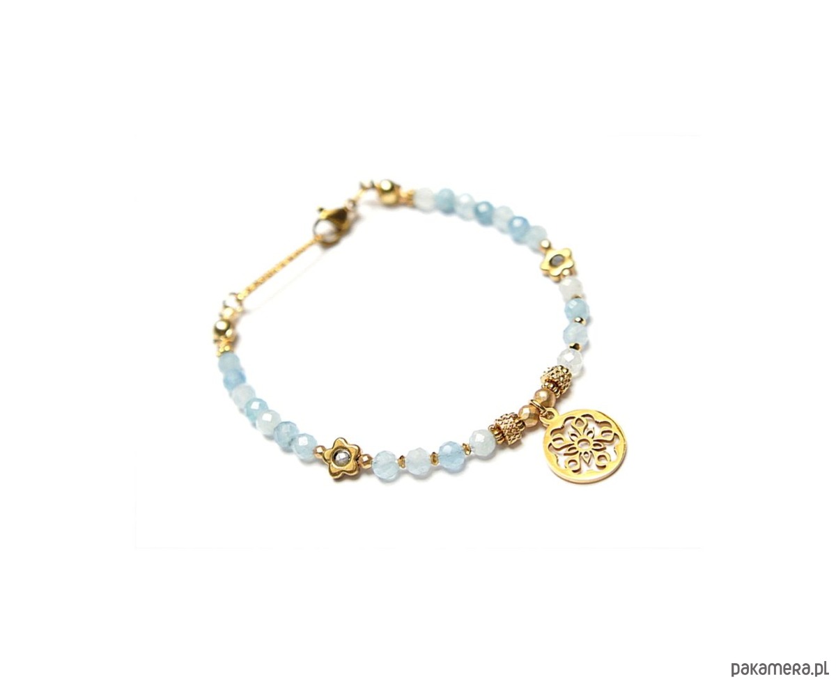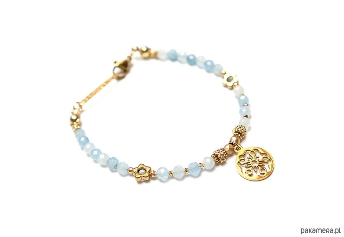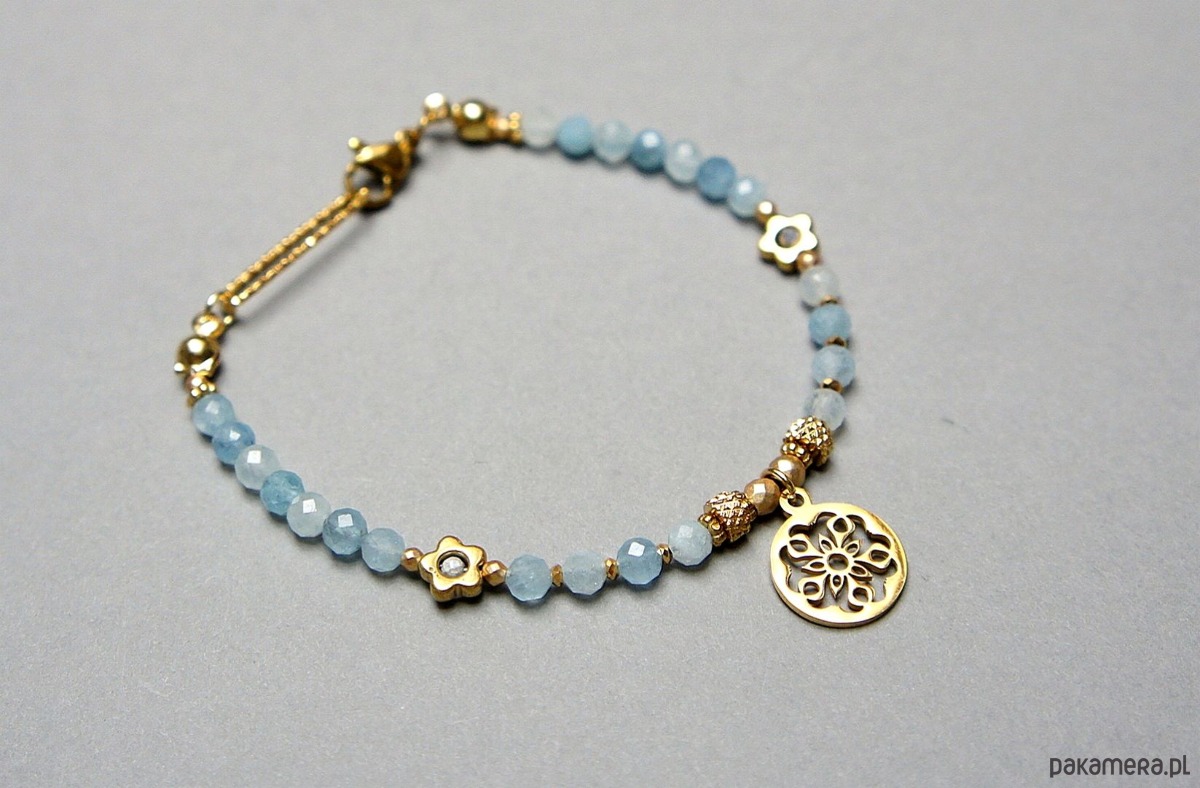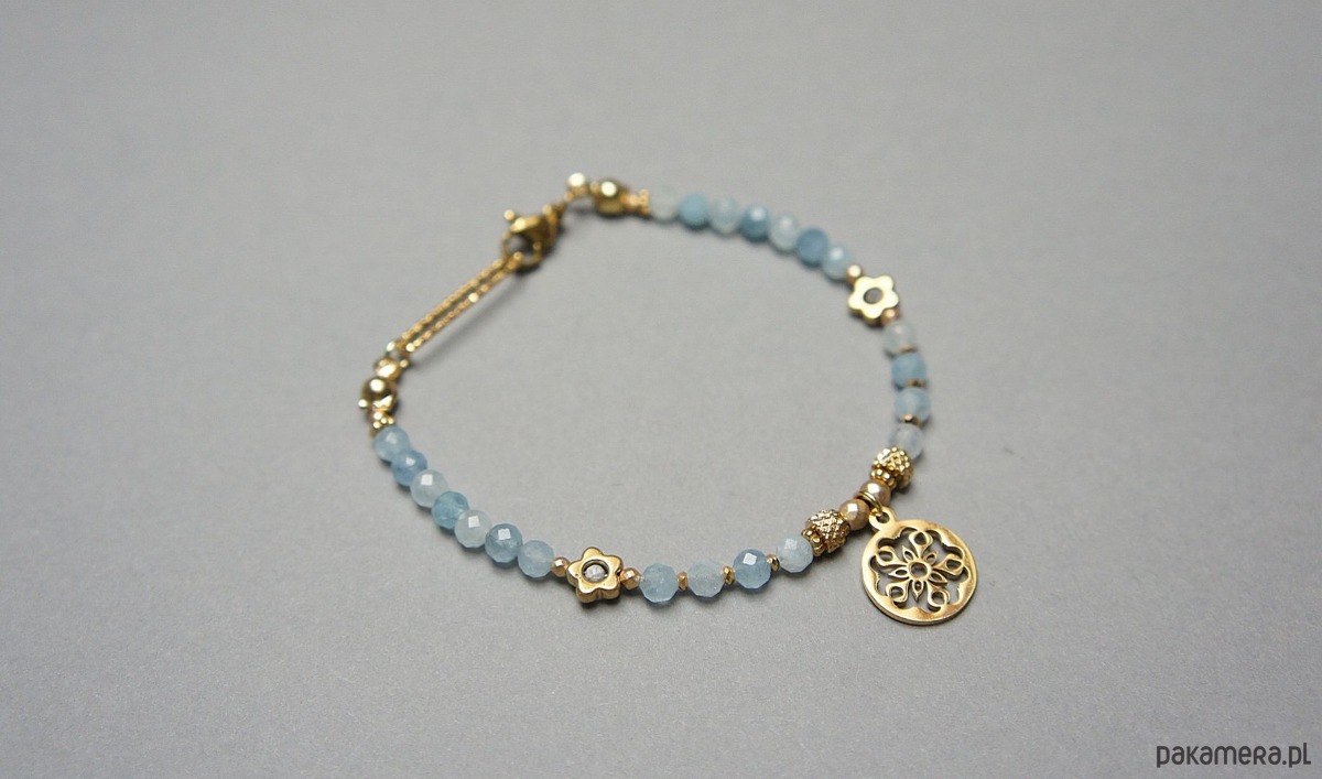 Delikatna bransoletka wykonana w całości ze stali szlachetnej pozłacanej, szlachetnych kamieni - akwamaryn fasetowany [4mm], szafir fasetowany w błękitnym kolorze [2mm], hematyt fasetowany, platerowany [2 i 3mm], przekładek z hematytu [1mm i kwiatki - 6mm]. Całkowita długość bransoletki 17,9cm. Może dopasować bransoletkę do innego nadgarstka - w tym celu wcześniej prosimy o kontakt.