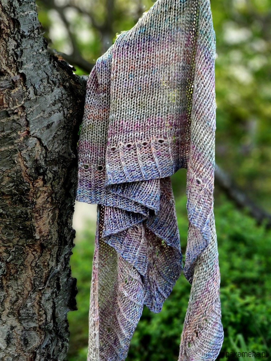 Chusta wykonana ręcznie na drutach z włoskich włóczek, jedna- to połączenie bawełny, lnu i wiskozy o delikatnej kolorystyce, druga jest mieszanką cudownie miękką - to jedwab z delikatną wełną wielbłądzią ( 50/50%). Razem dały piękną lejącą dzianinę, która otuli nas w chłodne letnie poranki i wieczory, a także osłoni nasze ramiona w potrzebie- przed upalnym słońcem.