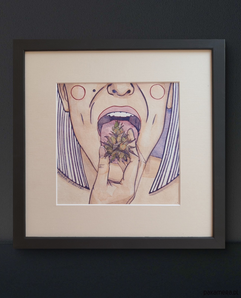 Obraz oprawiłam w prostą, drewnianą, czarną ramę o wymiarach 30x30cm z zawieszką, beżowe passe partout i plexi, tak więc jest gotowy do powieszenia na ścianie. Akwarela została namalowana na papierze akwarelowym Canson.