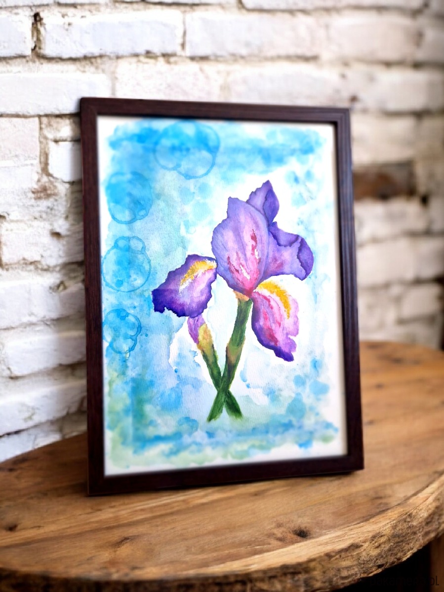 Piękna akwarela ręcznie malowana w ramce, gotowa to powieszenia na ścianie. Kwiat irys w oryginalnych barwach.