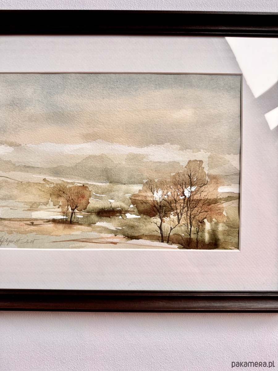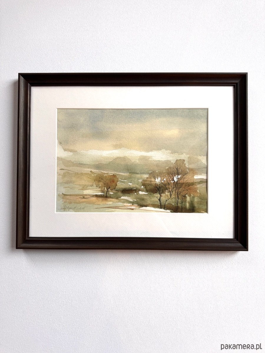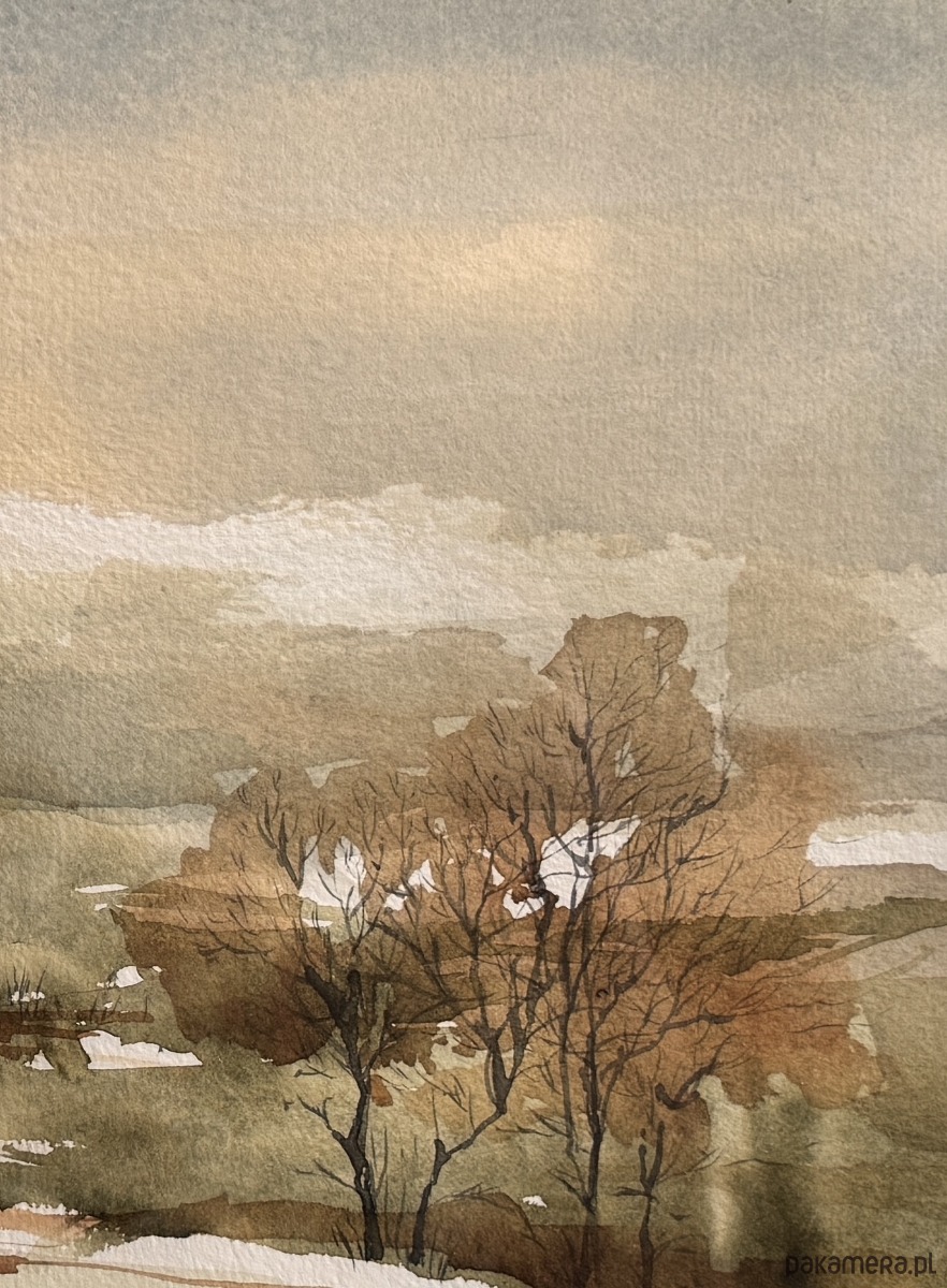 Nastrojowa akwarela, kolorystyka stonowana, szarości, błękity i brązy.