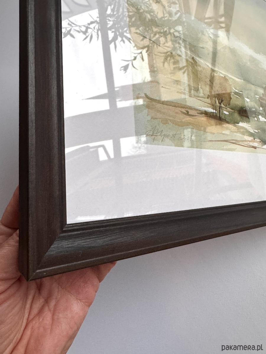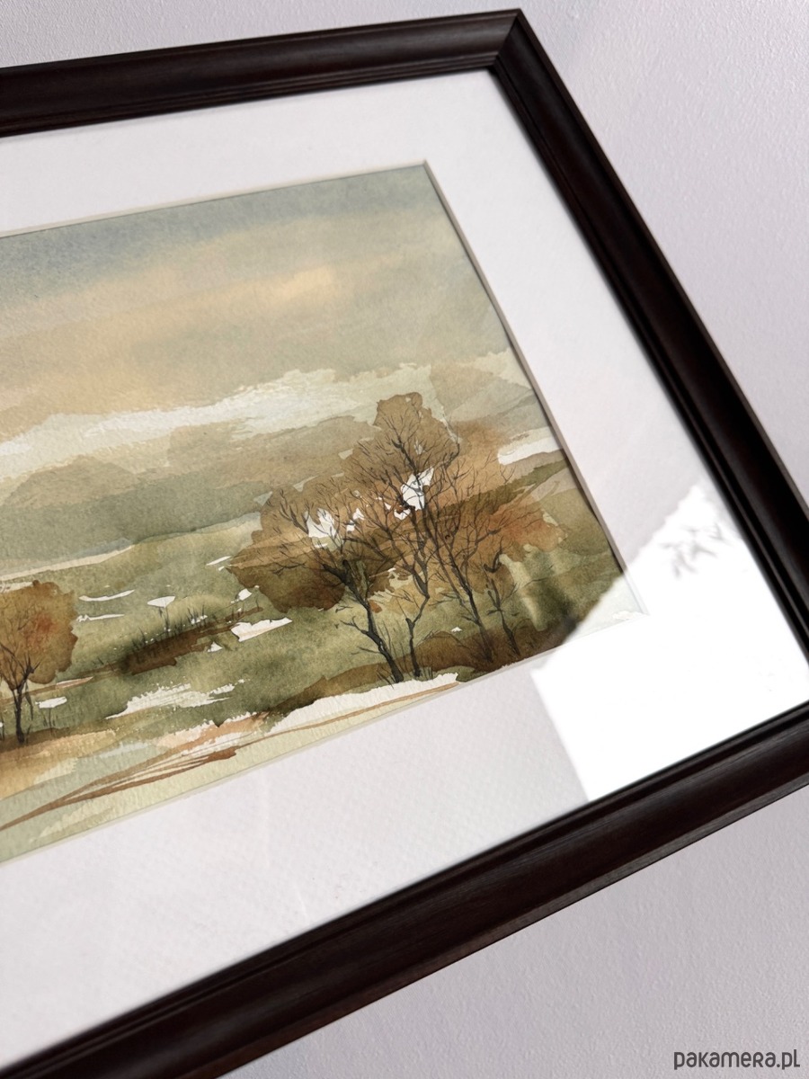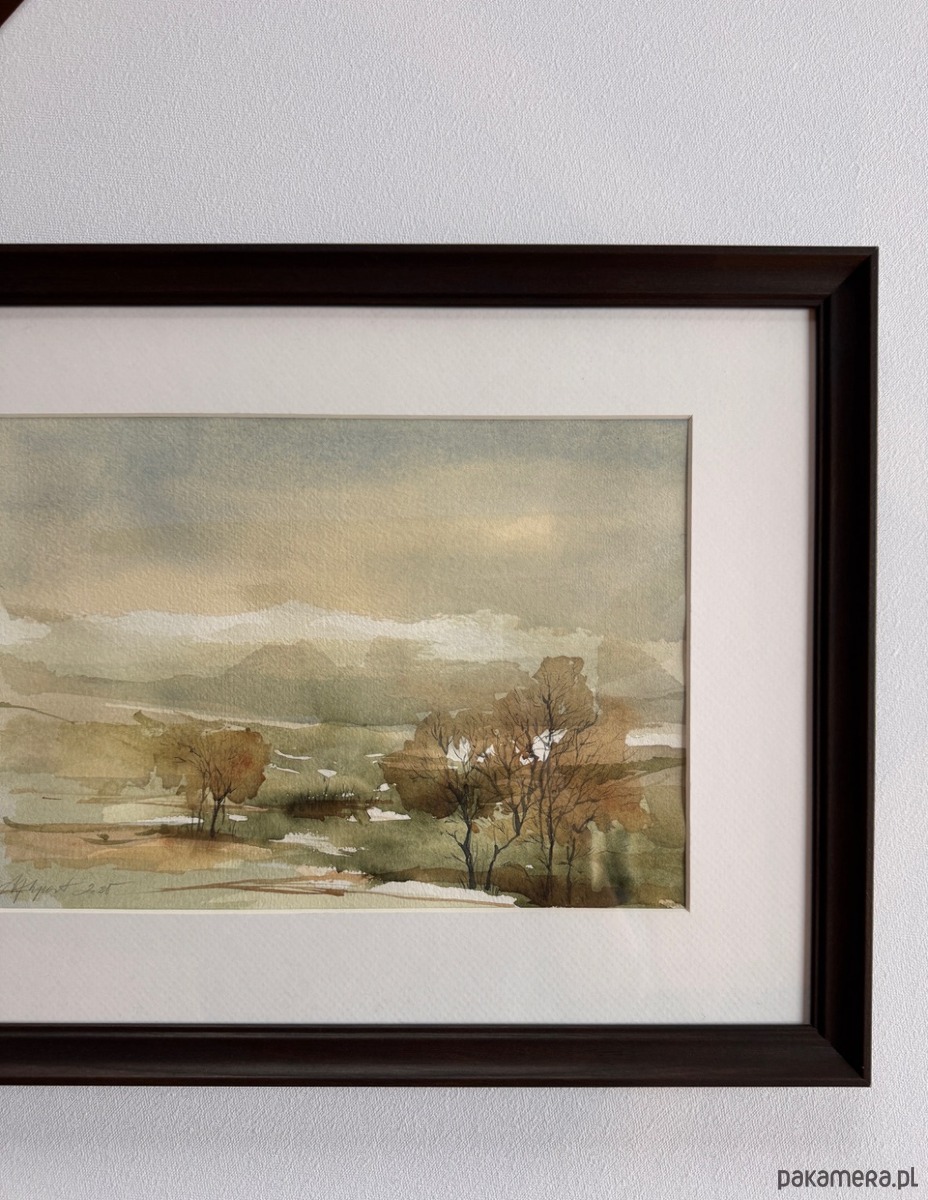 Nastrojowa akwarela, kolorystyka stonowana, szarości, błękity i brązy.