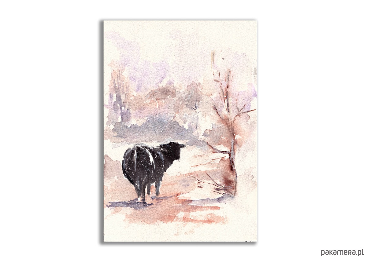 Temat mojej nowej akwareli to samotność, spokój i wytrwałość. Samotne zwierzę pośrodku pustego, zimowego pola staje się symbolem cichej egzystencji i pogodzenia się z losem oraz naturą. Obraz uczy dostrzegania piękna w surowości i minimalizmie, sugerując, że nawet w chłodnych i nieprzyjaznych chwilach życia można odnaleźć wewnętrzny spokój i własne miejsce. Kontrast czerni zwierzęcia z bielą śniegu symbolizuje indywidualizm i zachowanie własnej tożsamości w świecie, który zdaje się nas przytłaczać swoją monotonią.