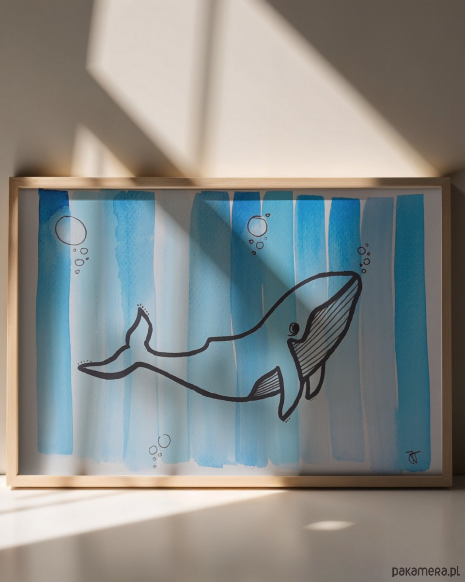 Ręcznie malowana grafika wieloryba. Jedyny taki egzemplarz, oryginał.