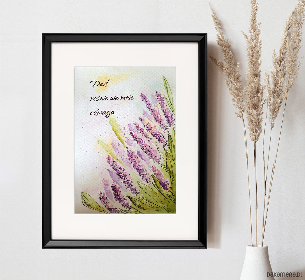 Akwarela z lawendą i afirmacją: Dziś rośnie we mnie odwaga.