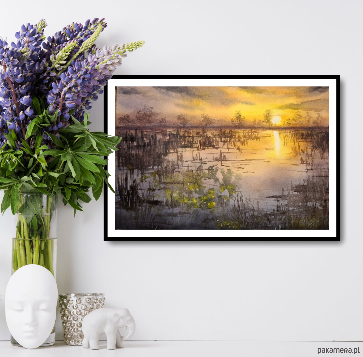 Akwarela - Zachód nad rozlewiskiem oprawiona 30/40 cm
