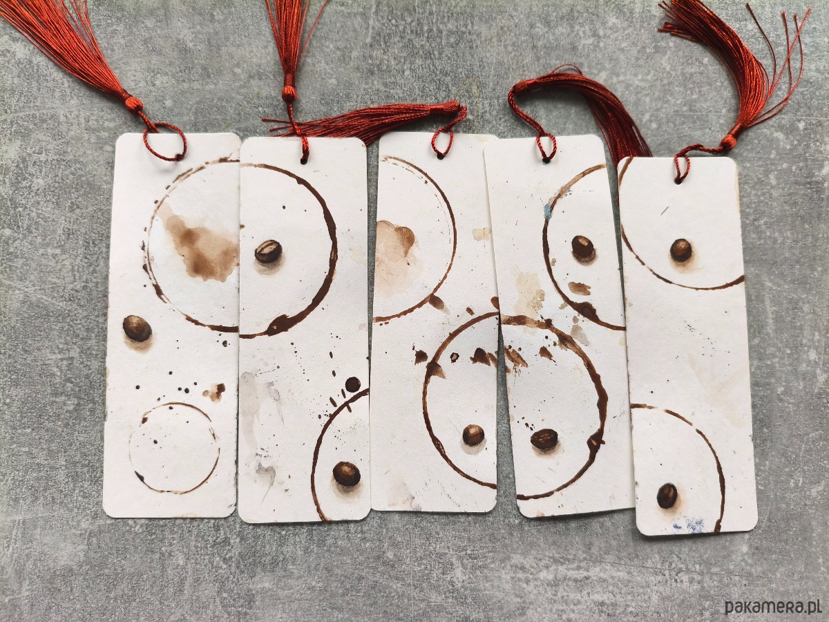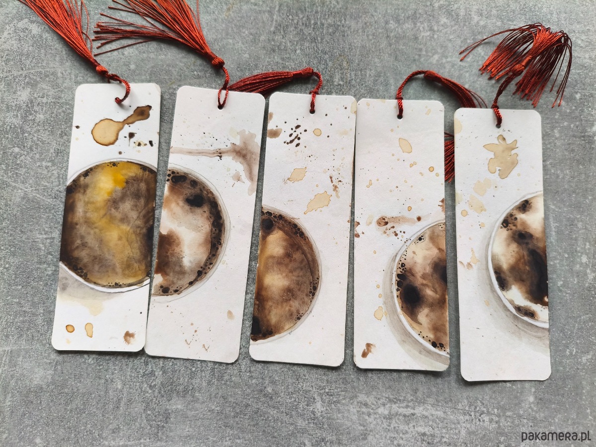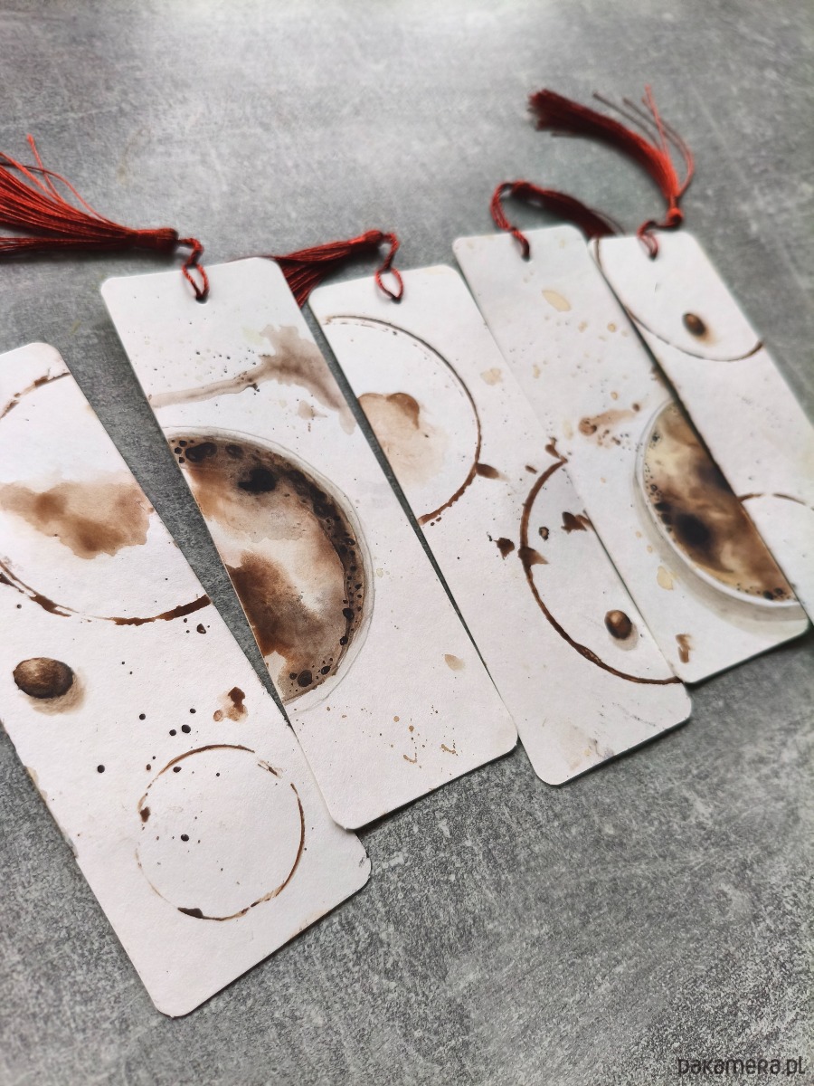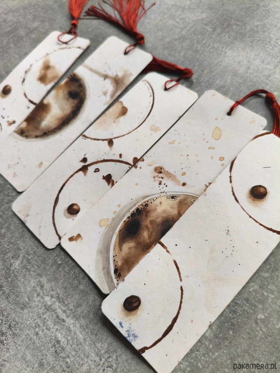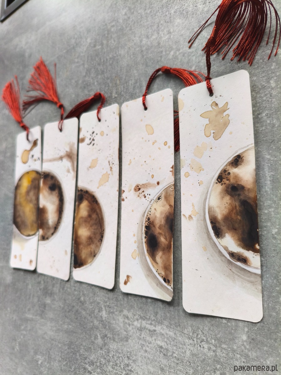 Zakładki zostały stworzone z dbałością o detale w technice akwareli. Brązowe i karmelowe odcienie idealnie naśladują wygląd kawy, a całość ma ciepły i klimatyczny charakter.