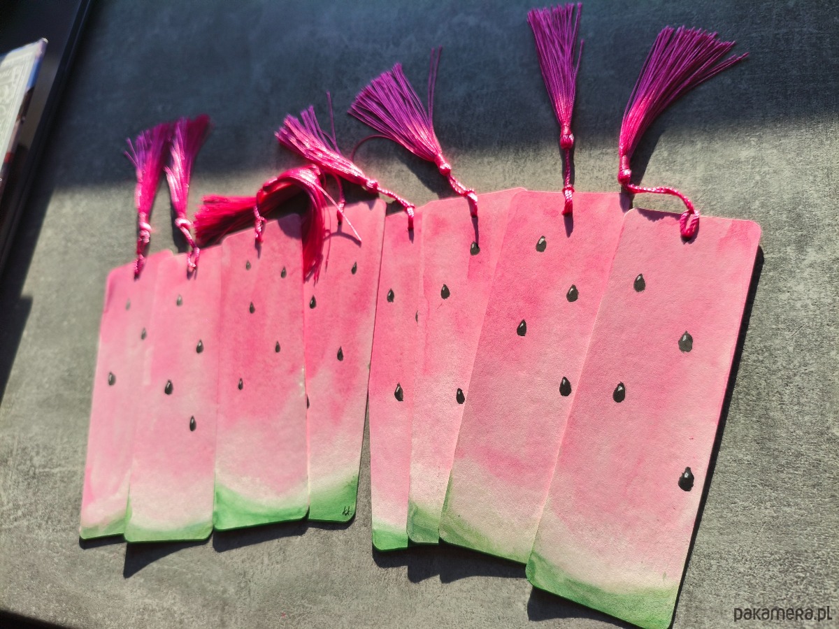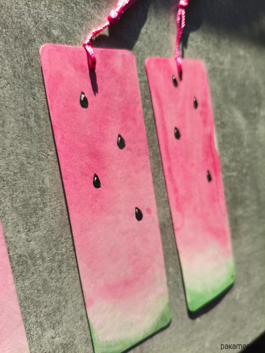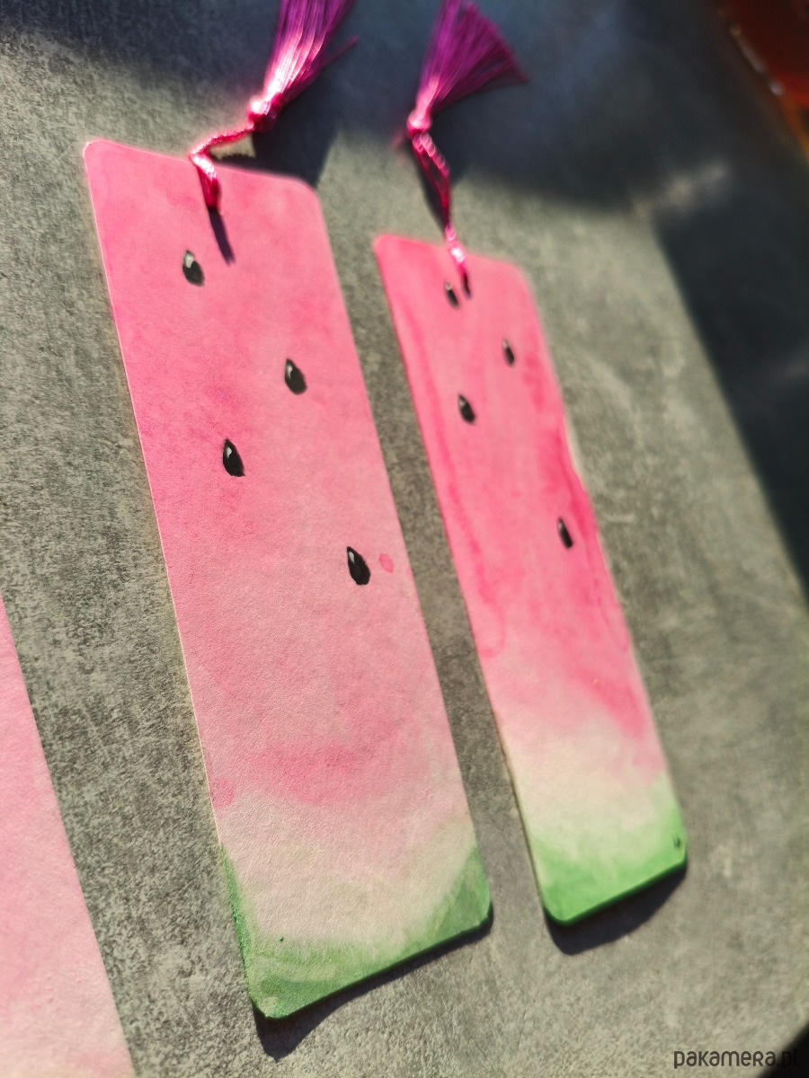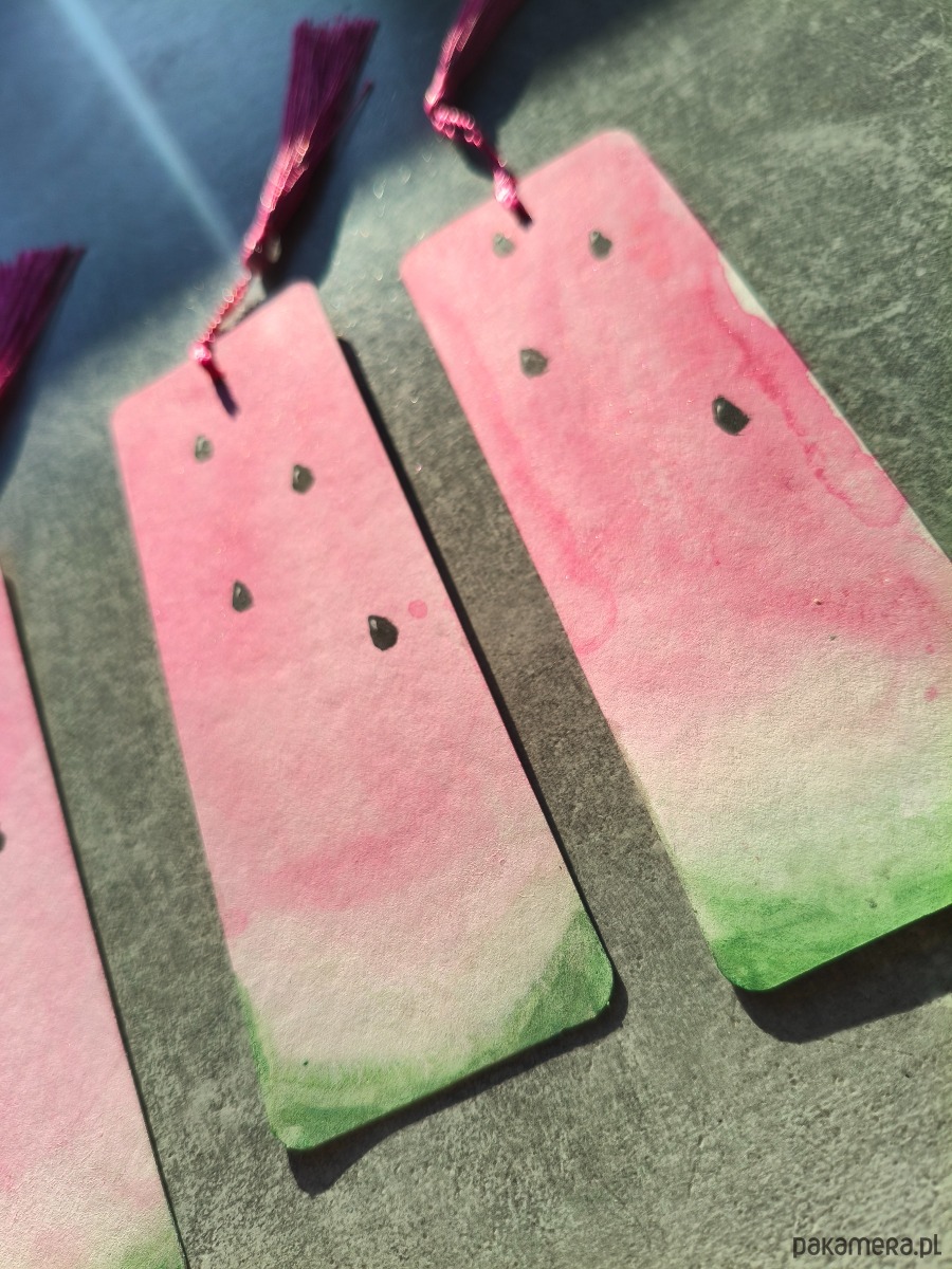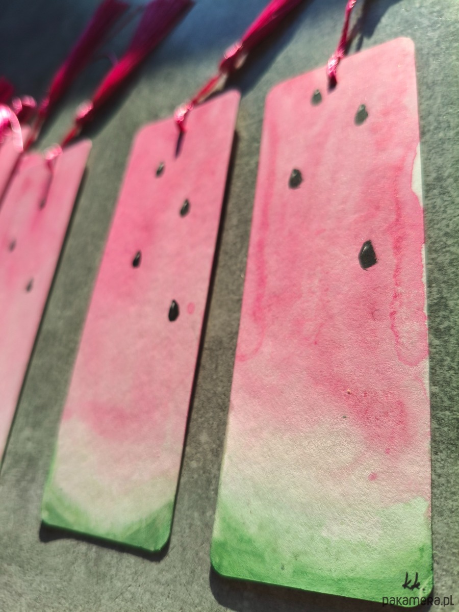 Każda zakładka została stworzona z dbałością o najdrobniejsze detale, przy użyciu techniki akwareli. Wyrazisty róż oraz intensywna zieleń idealnie oddają letni klimat, a namalowane z precyzją pestki dodają im realistycznego uroku.