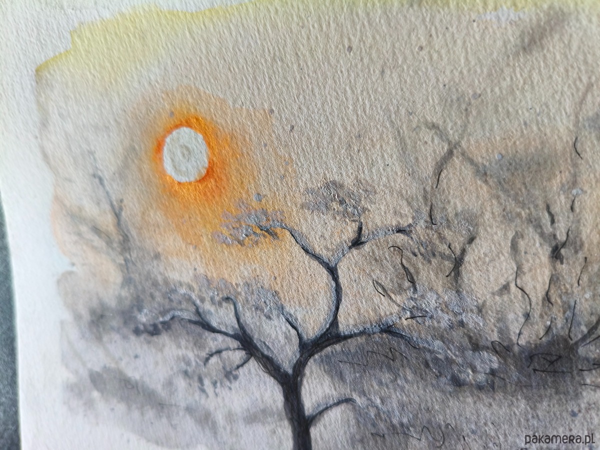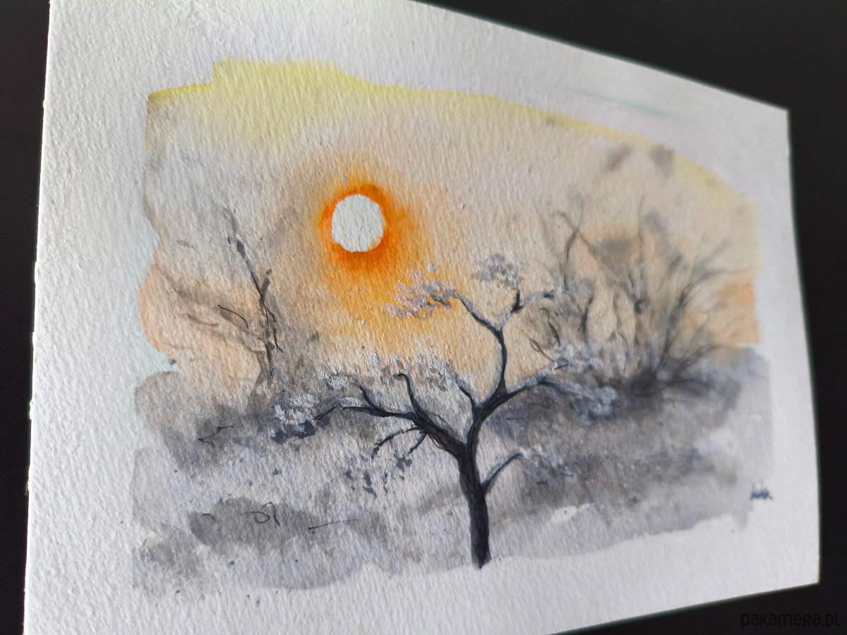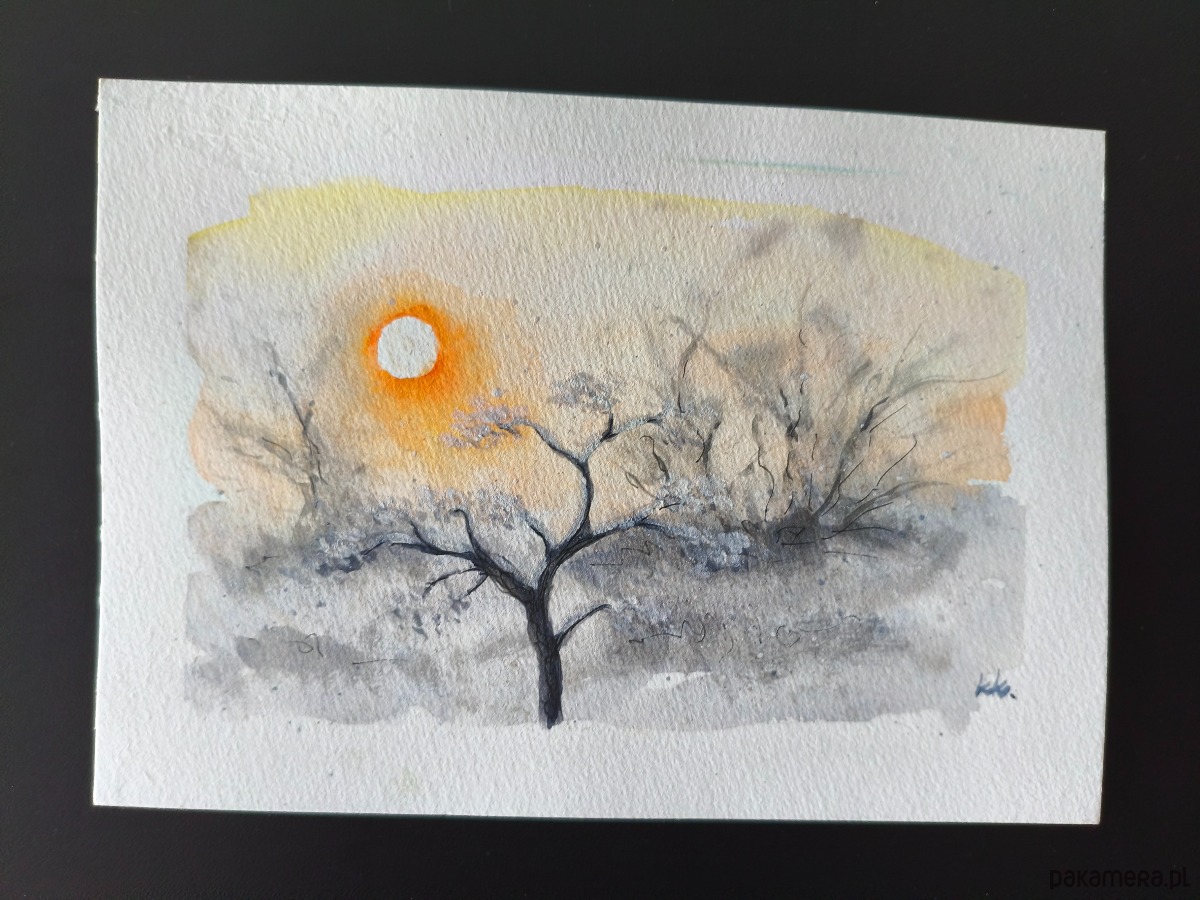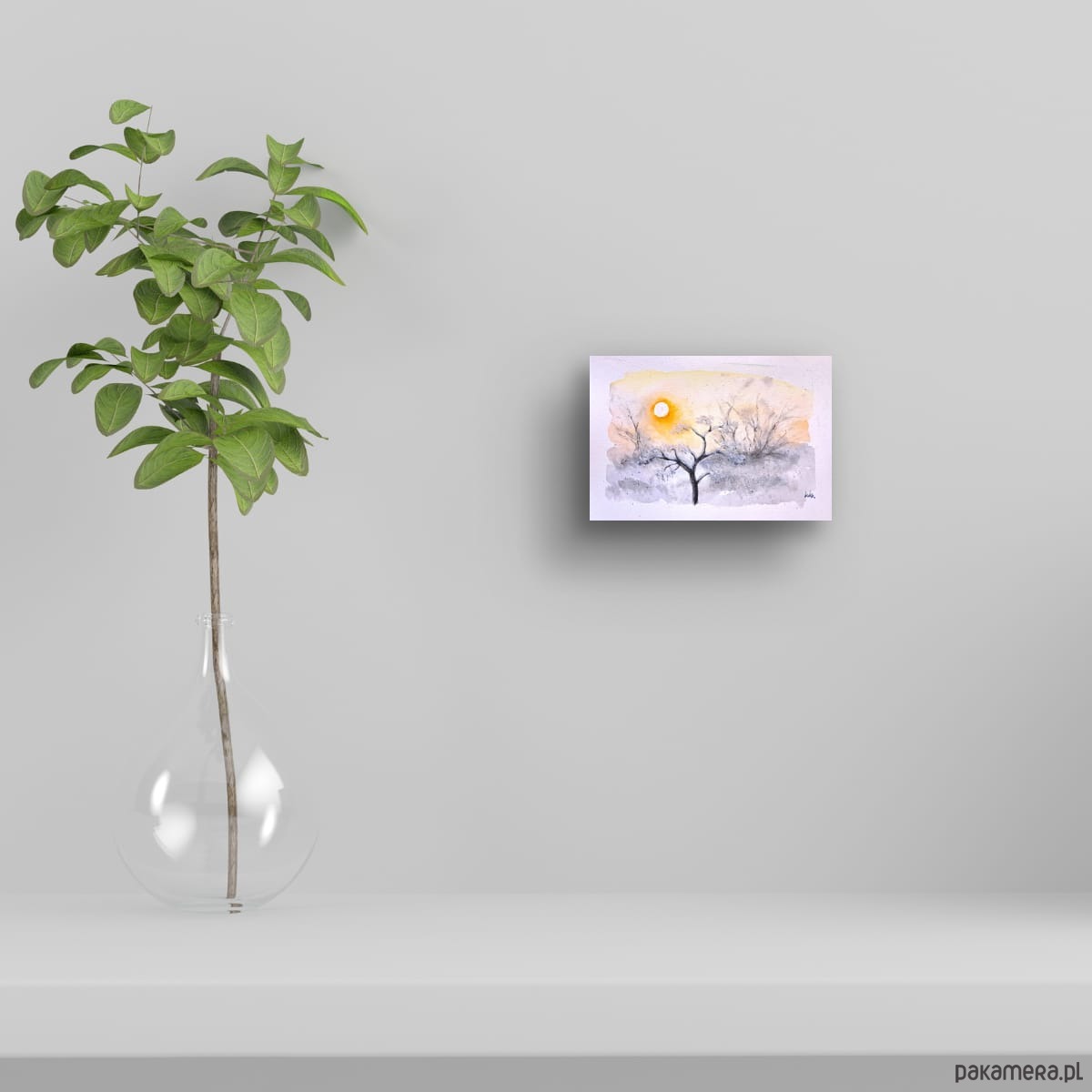 Akwarele ZIMA Miesiące Krajobraz Rośliny obraz słońce wschód śnieg