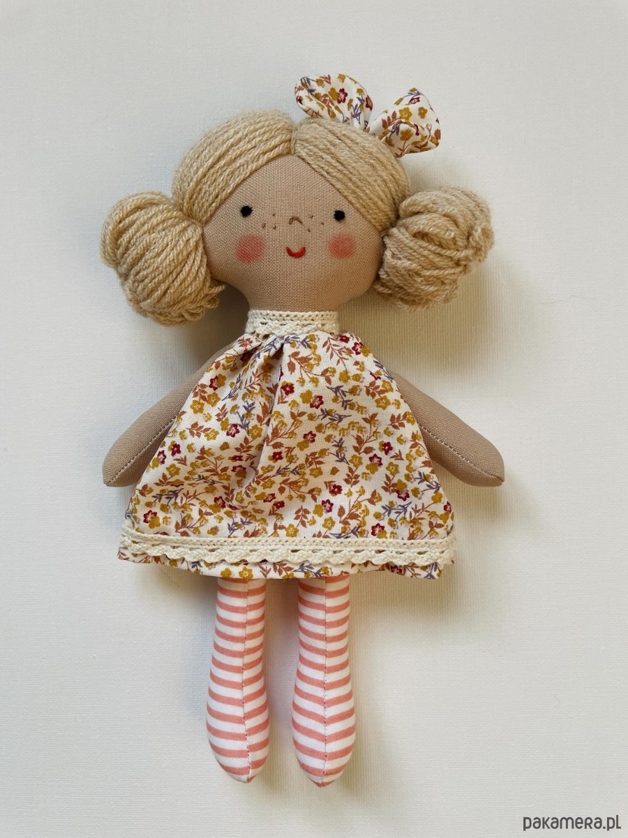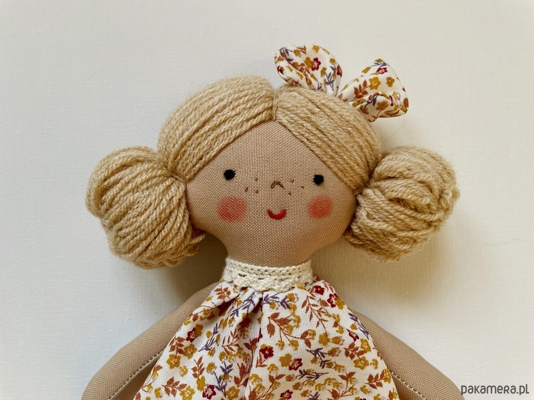 Mała Lala Ala w sukience w drobne kwiatuszki i kokardą na głowie. Sukienka nie jest zdejmowana. Lala wykonana jest z najwyższej jakości tkanin bawełnianych. Lala Ala to idealny prezent dla dziecka i najlepsza przytulanka .
