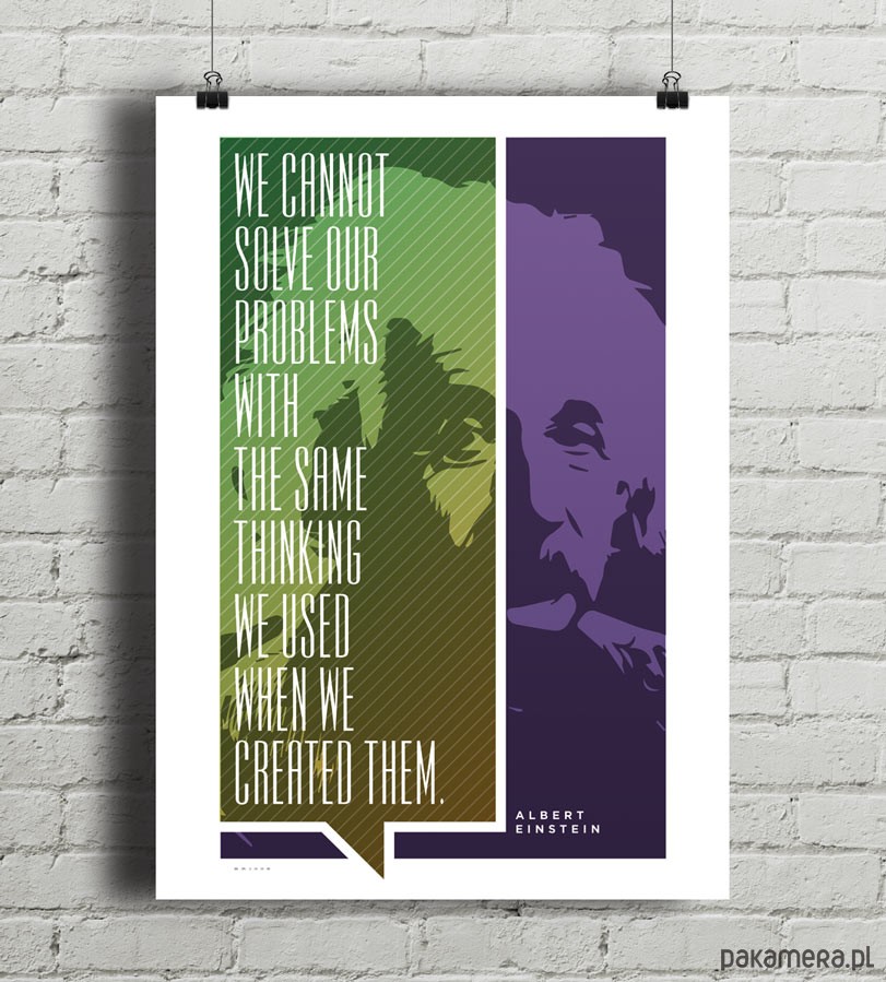 Plakat z autorską grafiką inspirowany postacią Alberta Einsteina i jego sentacją "We cannot solve our problems with the same thinking we used when we created them".