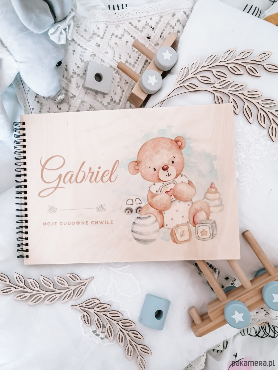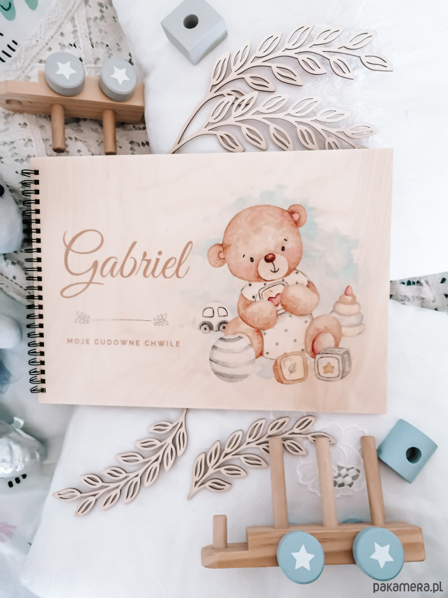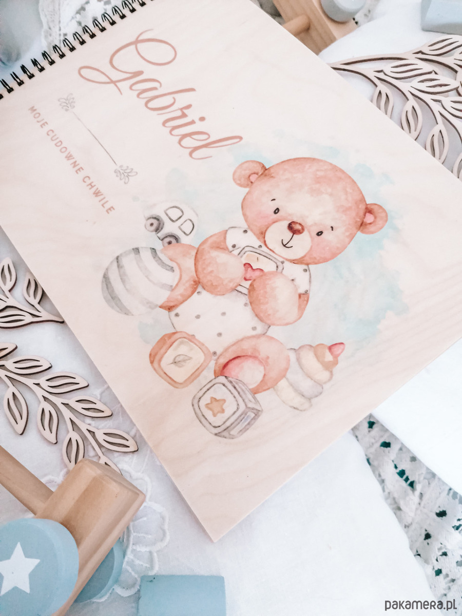 Album jest personalizowany - zawiera imię dziecka oraz dowolny napis. Personalizacja jest w cenie i oprócz imienia (lub imion) możemy umieścić na nim dowolny cytat, datę urodzin, czy godzinę narodzin.