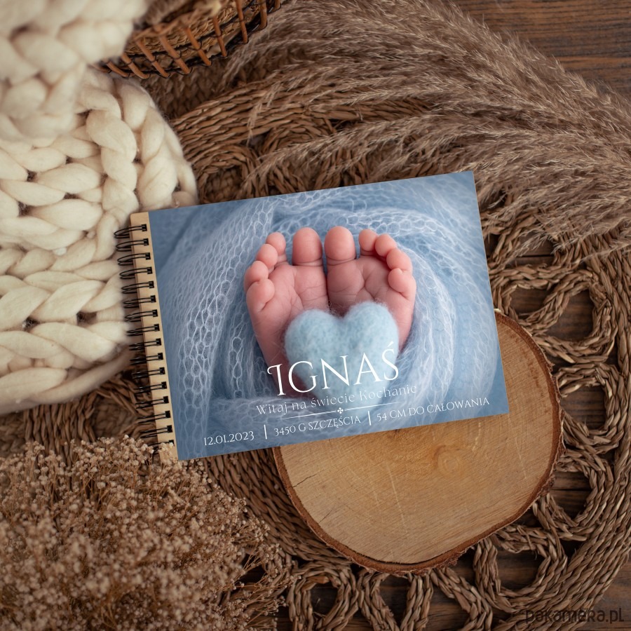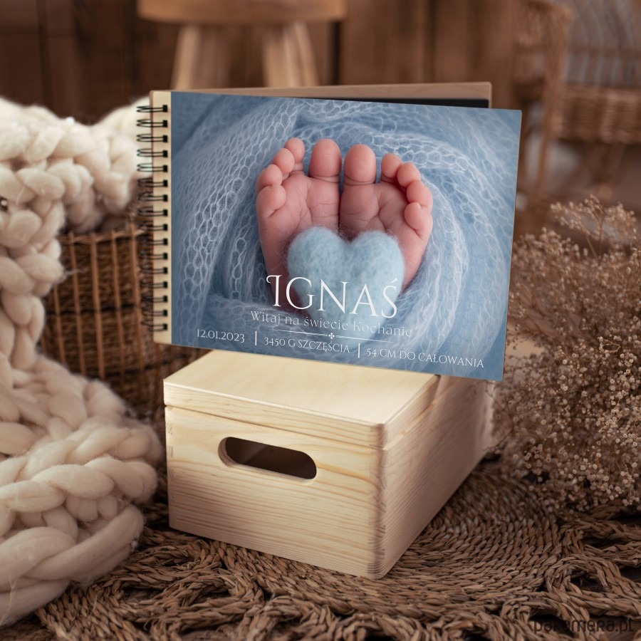 Śliczny drewniany album dla dziecka z okazji narodzin, chrztu z motywem uroczych stópek niemowlaka. To nasz bestseller. Personalizowany album z imieniem dziecka to wyjątkowy prezent z okazji babyshower, narodzin, chrztu.