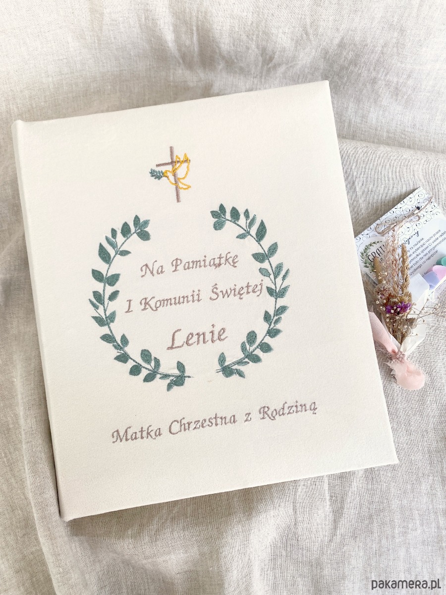 Album wykonany z dbałością o każdy detal, oprawiony w naturalną tkaninę (len), z delikatnym haftem dopasowanym do okazji.