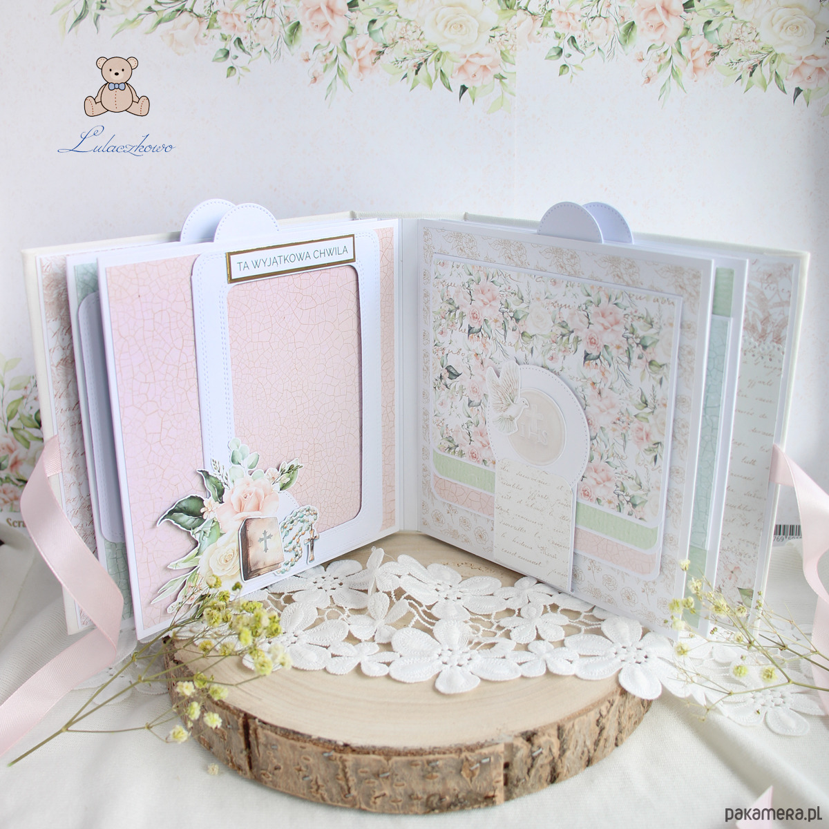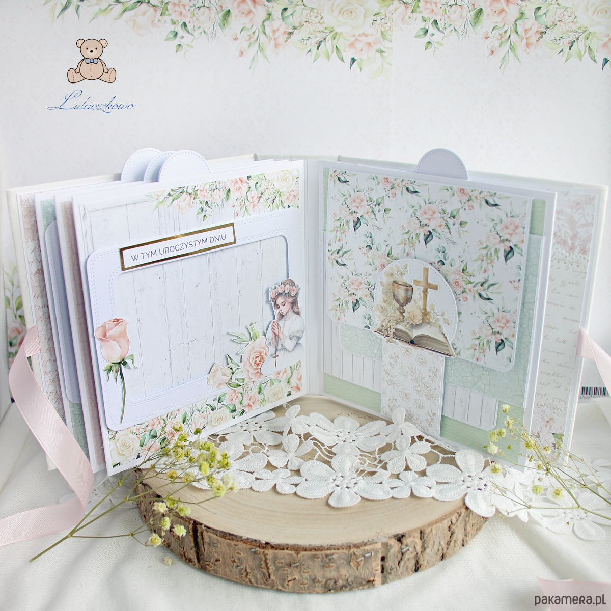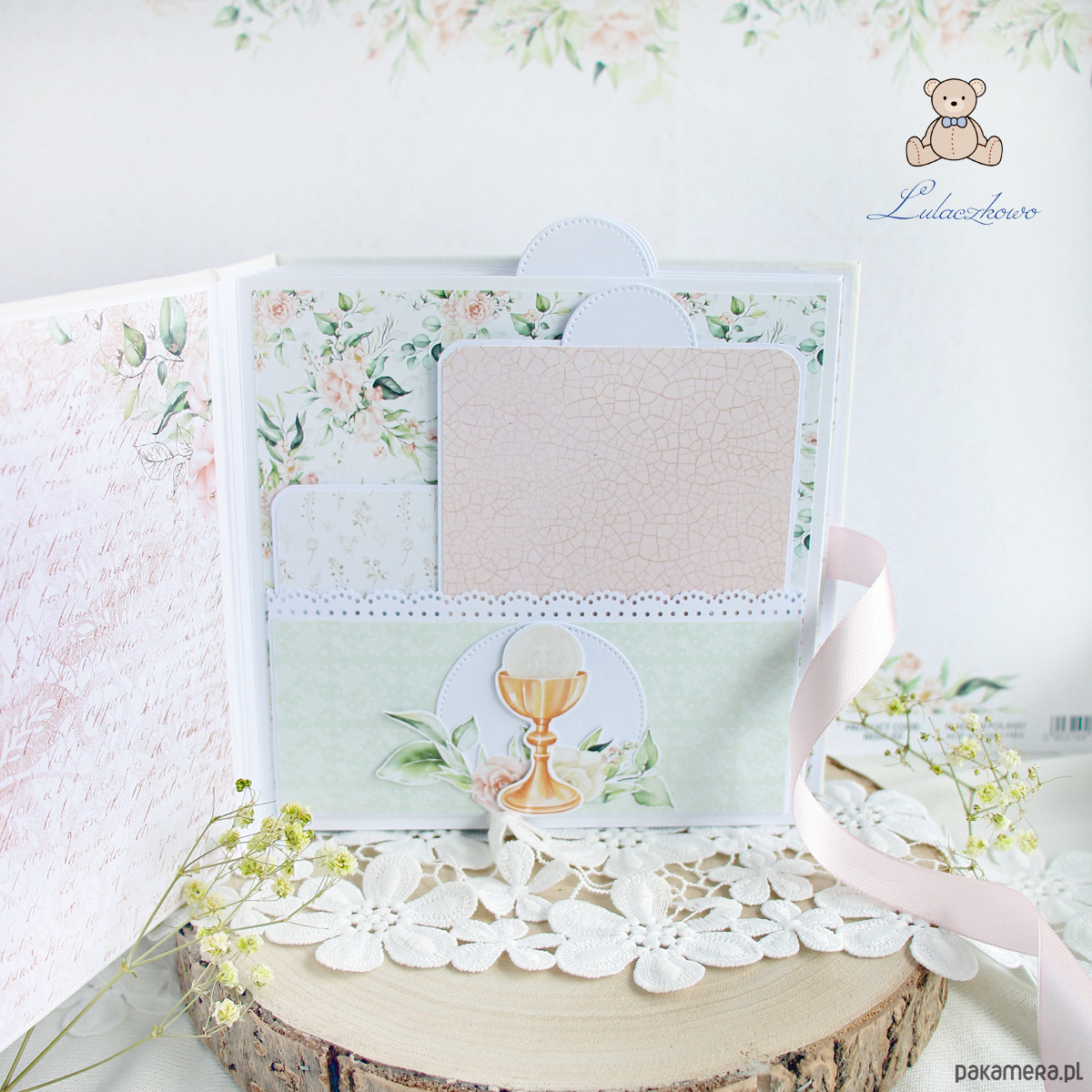 Przepiękny, bogato zdobiony album komunijny, robiony ręcznie, z dbałością o detale, wykonany z cudownej, kwiatowej kolekcji papierów "Beautiful Day". Idealny jako prezent - pamiątka z okazji Pierwszej Komunii Świętej.