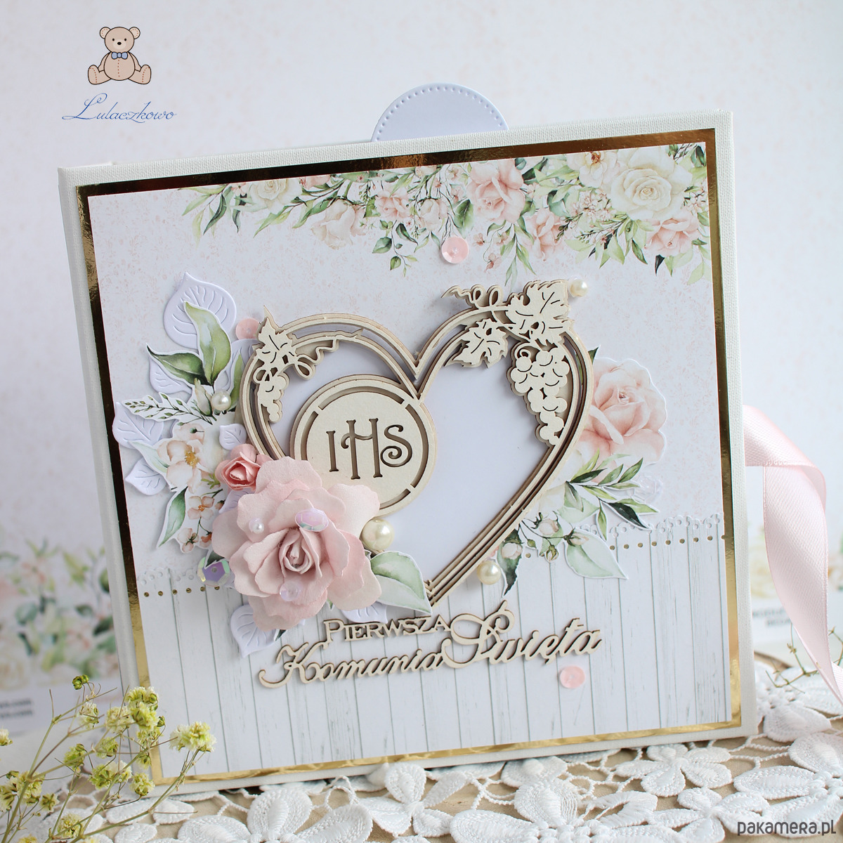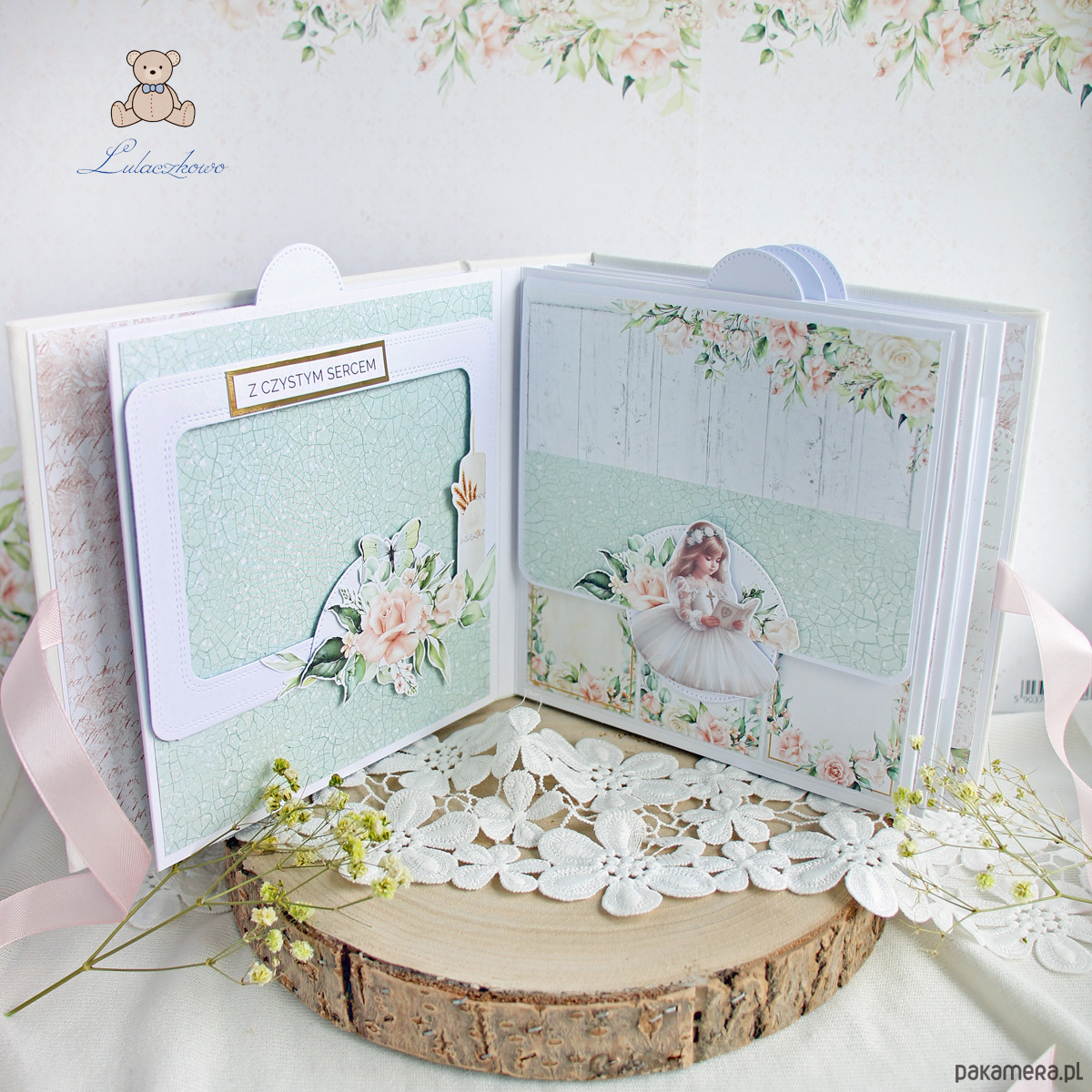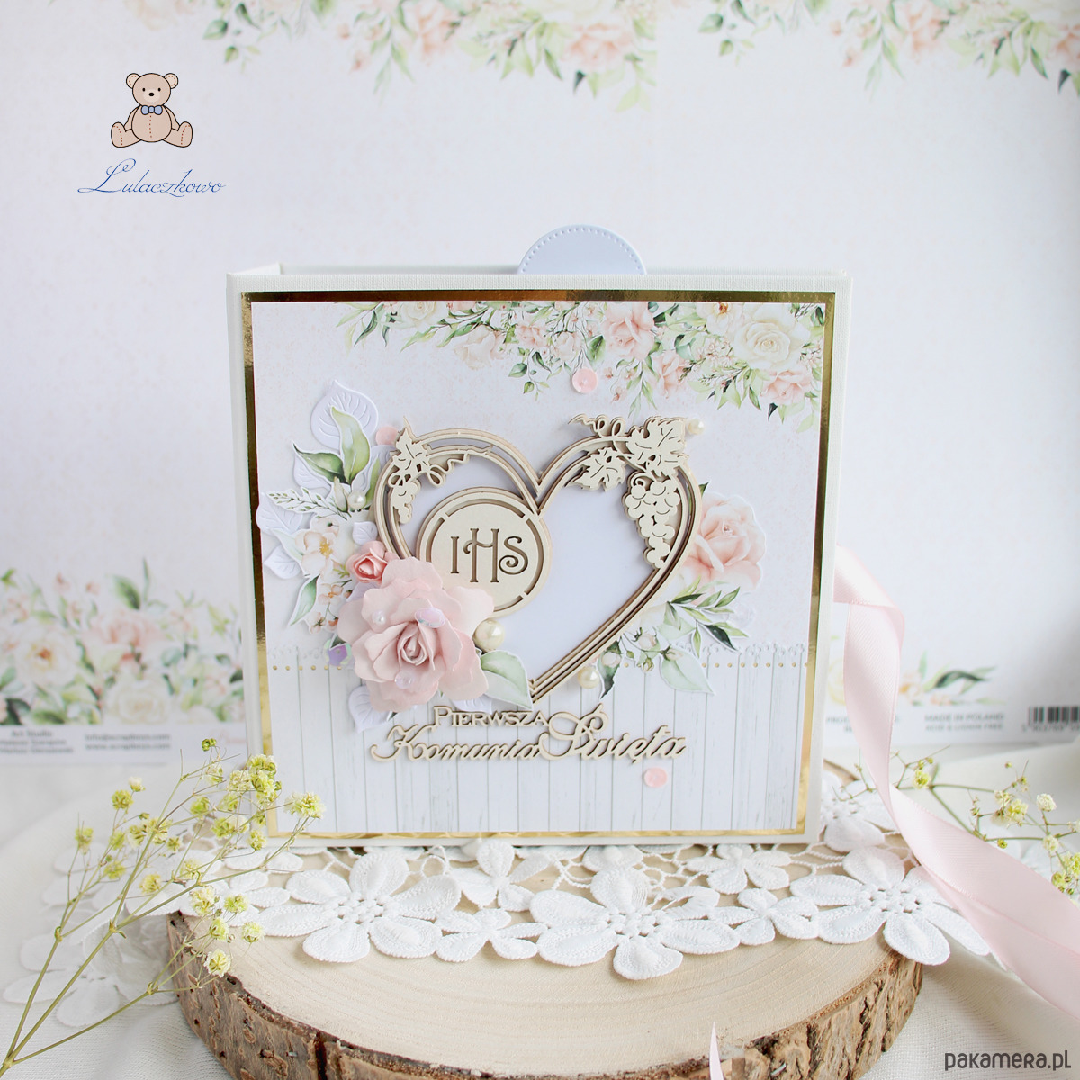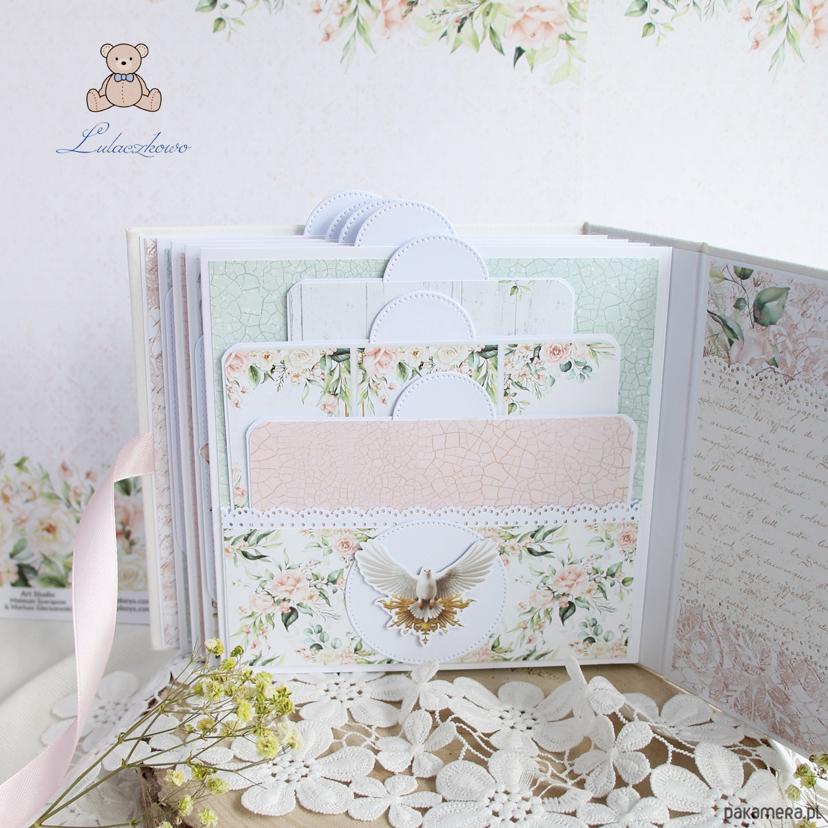 Przepiękny, bogato zdobiony album komunijny, robiony ręcznie, z dbałością o detale, wykonany z cudownej, kwiatowej kolekcji papierów "Beautiful Day". Idealny jako prezent - pamiątka z okazji Pierwszej Komunii Świętej.