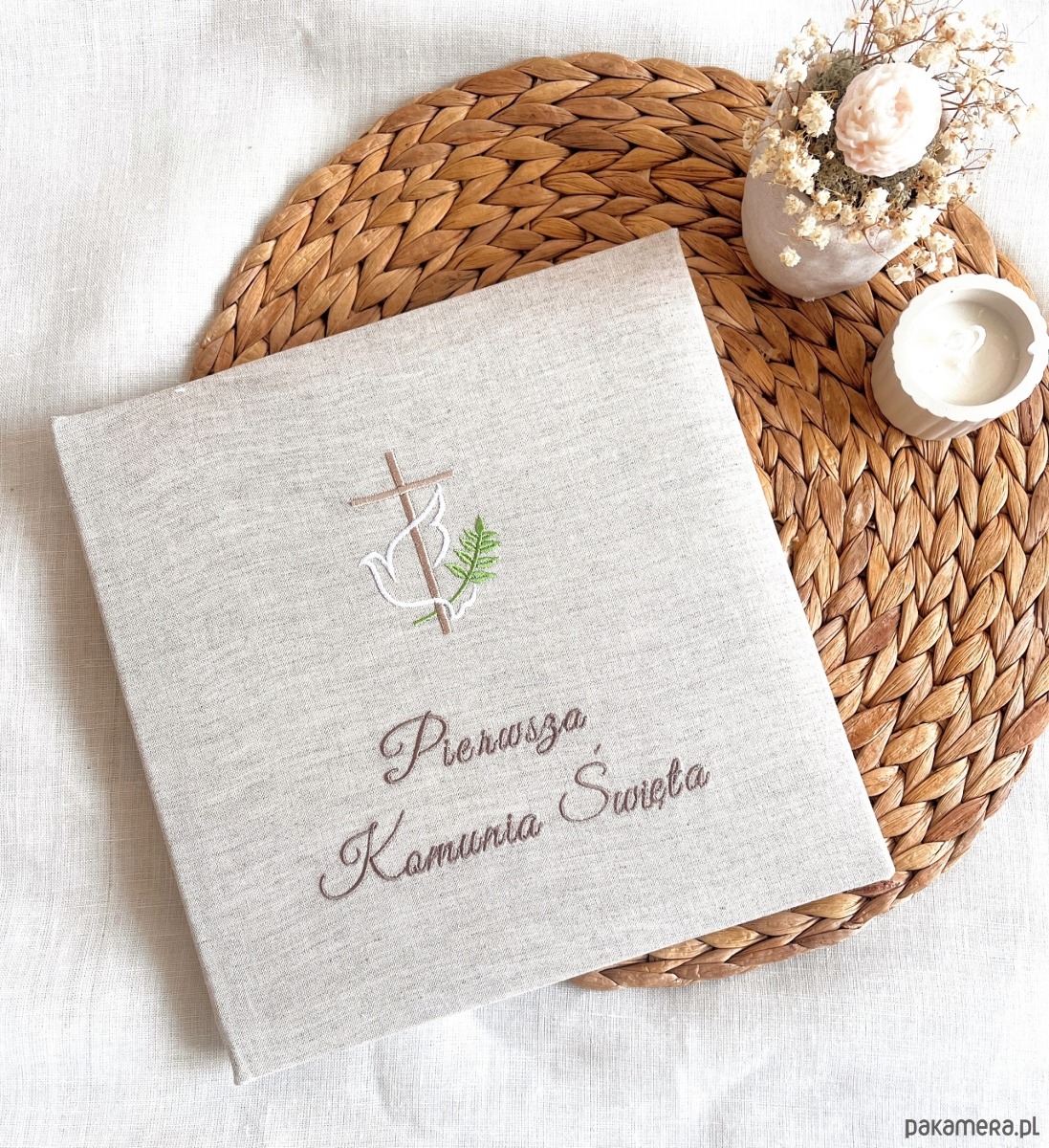 Album wykonany z dbałością o każdy detal, oprawiony w naturalną tkaninę (len), z delikatnym haftem dopasowanym do okazji.