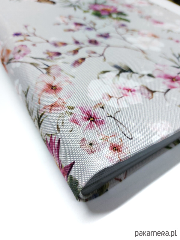 Do oklejenia oprawy użyłam pięknej wodoodpornej tkaniny z malowanymi kwiatami i motylami.