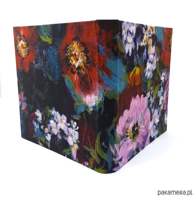 Album Kwiaty to album wykonany ręcznie w bardzo dobrych materiałów, każdy z egzemplarzy różni się od siebie układem roślinnym i wewnątrz ma modne w tym roku karty koloru czarnego. album otwiera się na płasko, dzięki czemu zdjęcia można wykleić na całej karcie