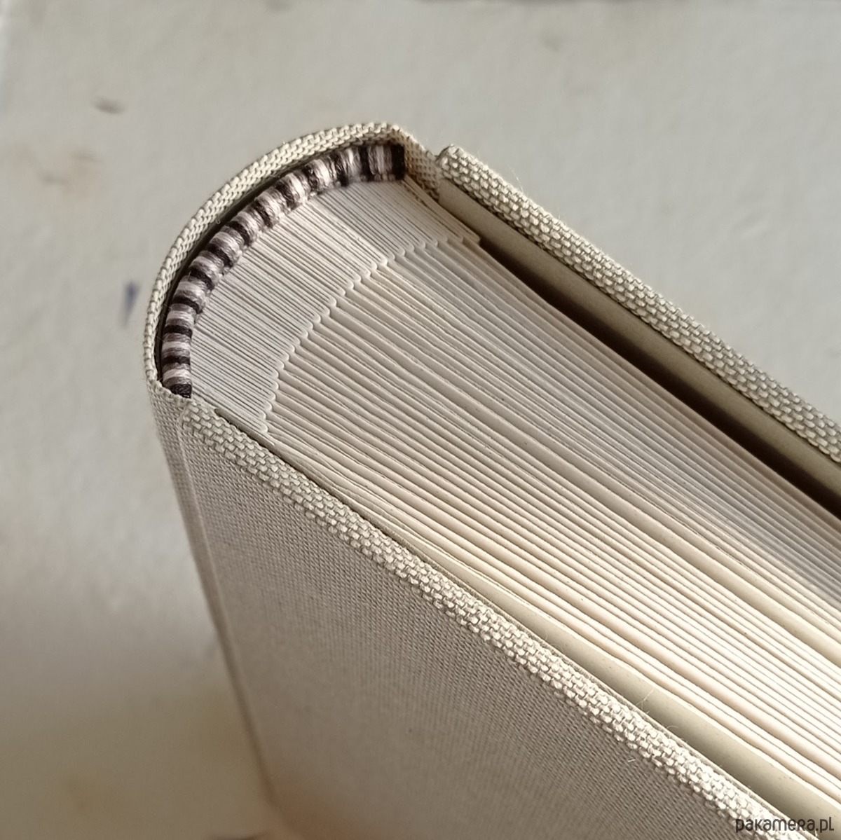 Grzbiet albumu ozdobiony jest wykonaną ręcznie kapitałką w kilku kolorach naszywaną bezpośrednio na grzbiecie albumu