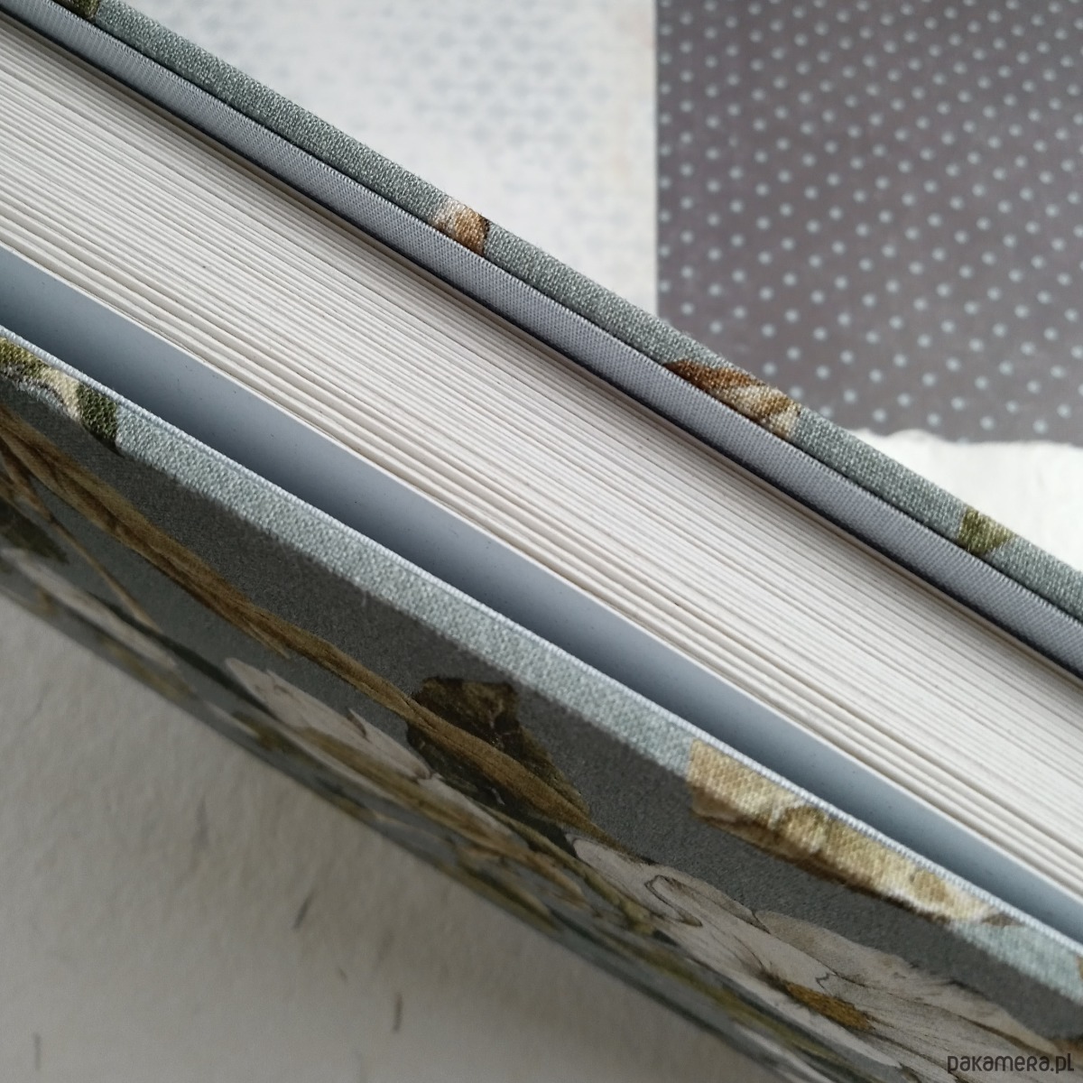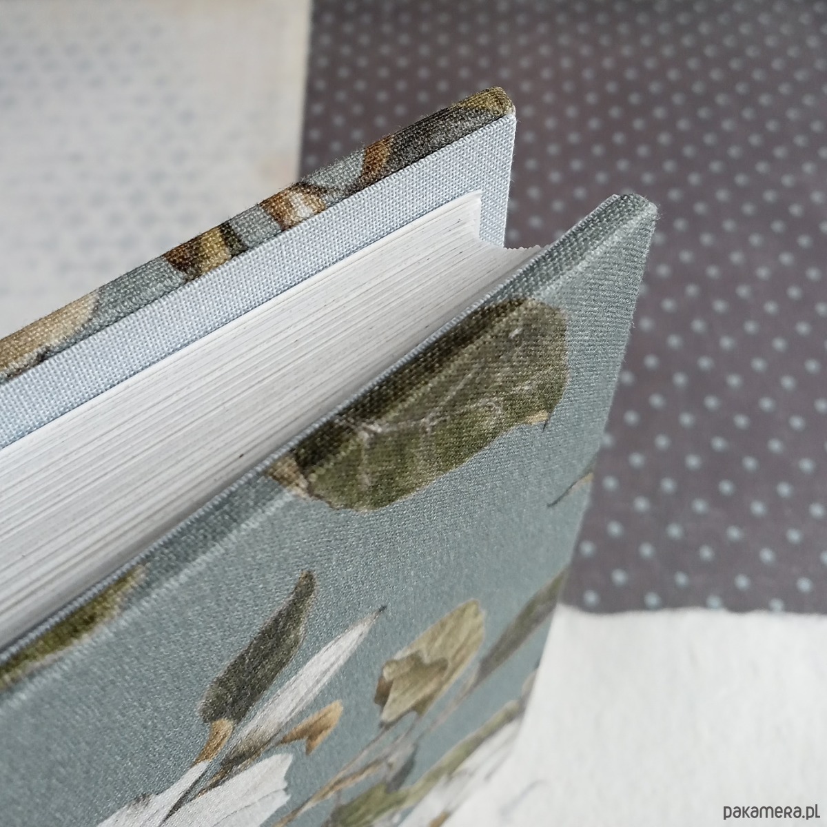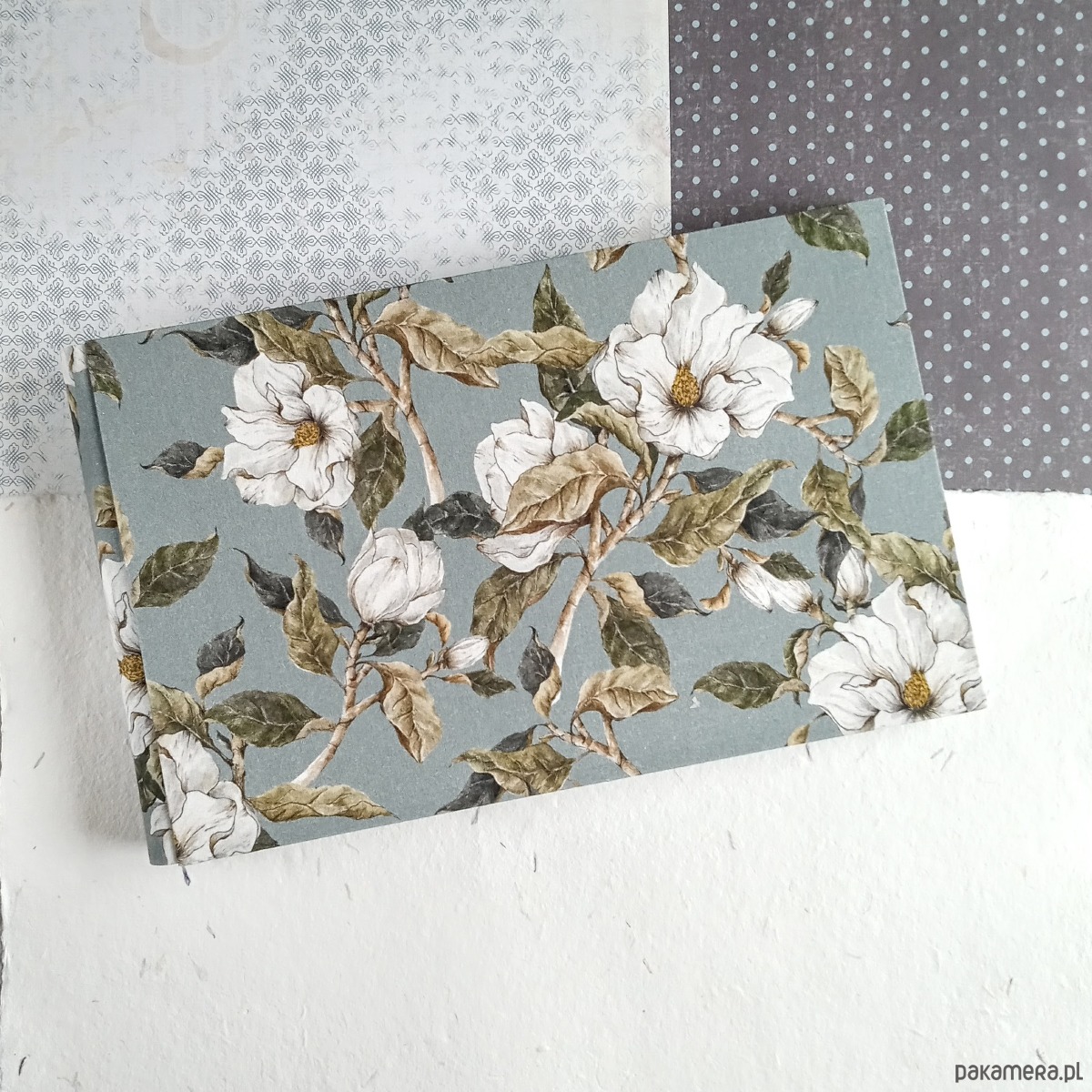 Okładka albumu oprawiona jest w bawełnianą tkaninę wypełnioną kwiatami magnolii,