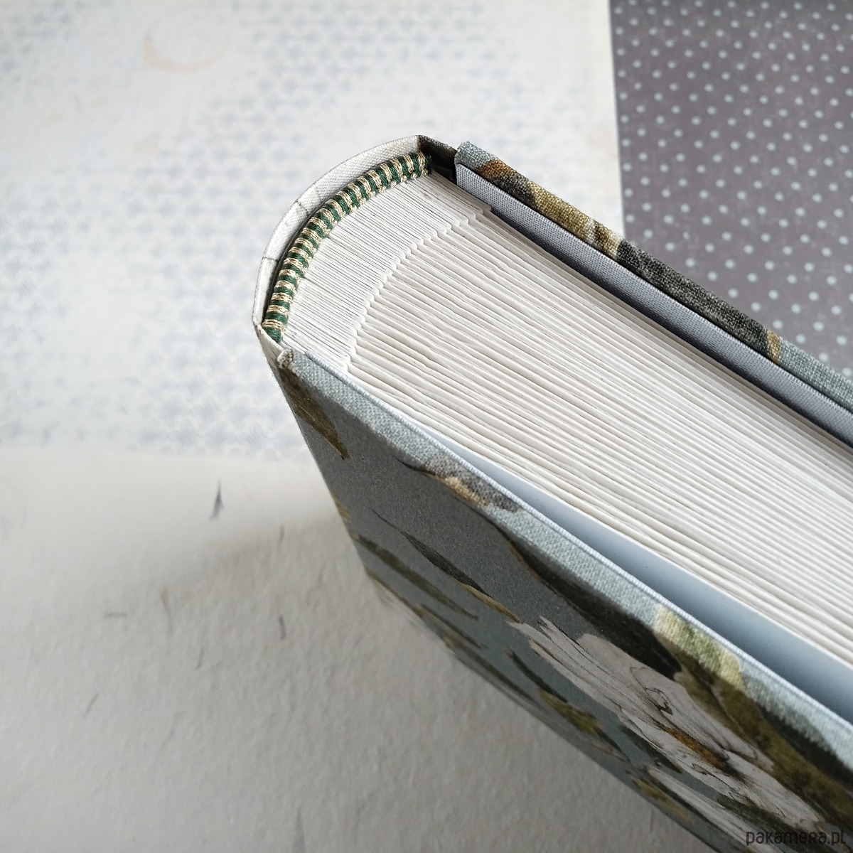 Grzbiet albumu ozdobiony jest ręcznie haftowaną kapitałką w kilku kolorach naszywaną bezpośrednio na bloku książkowym