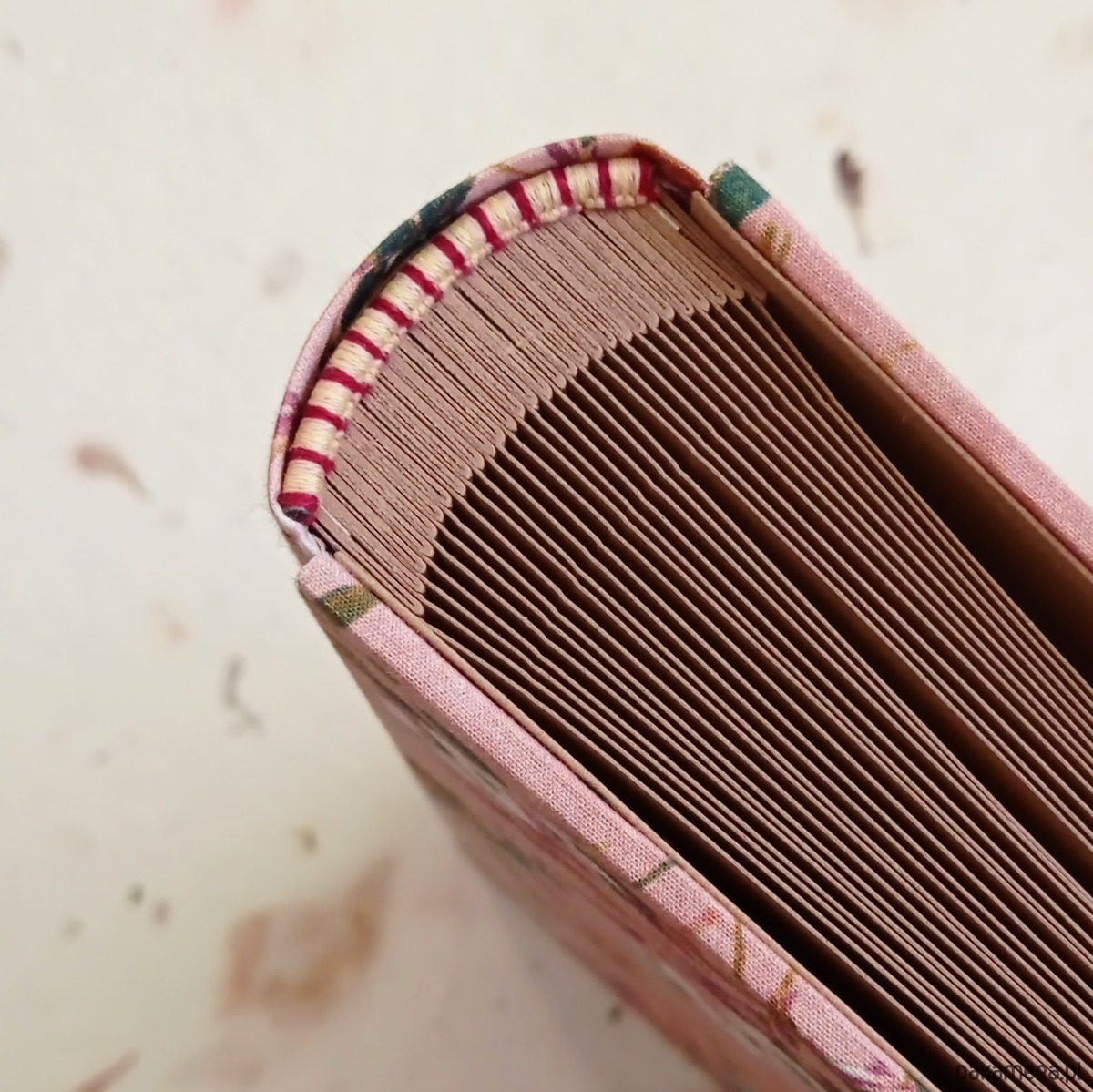 Grzbiet albumu ozdobiony jest wykonaną ręcznie kapitałką w kilku kolorach naszywaną bezpośrednio na grzbiecie albumu
