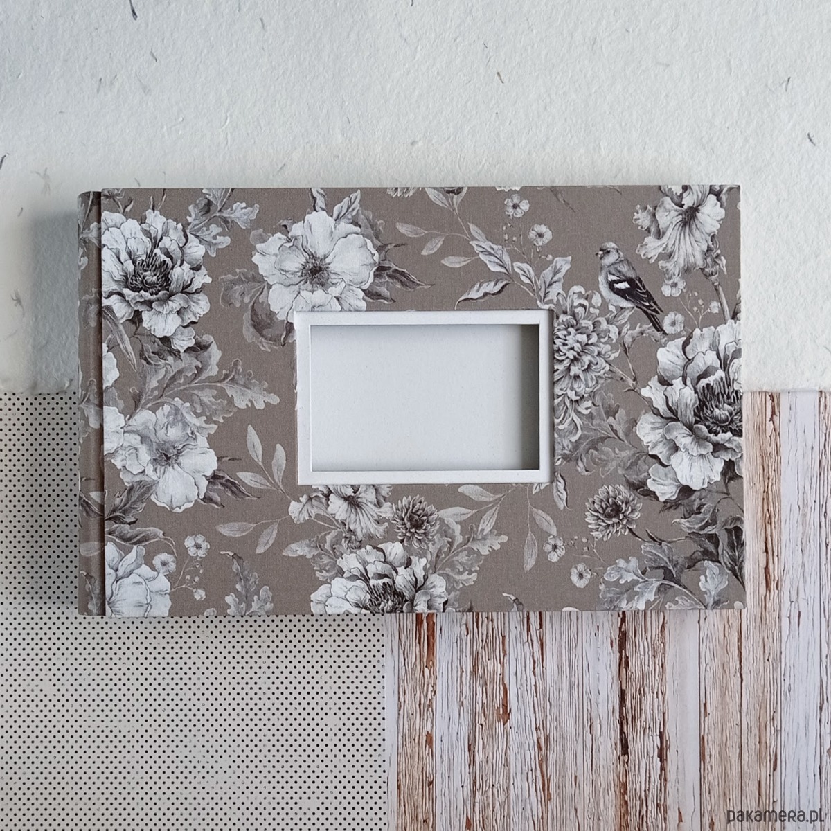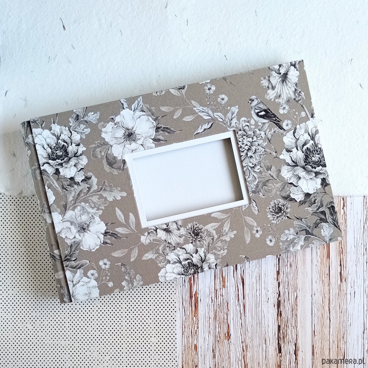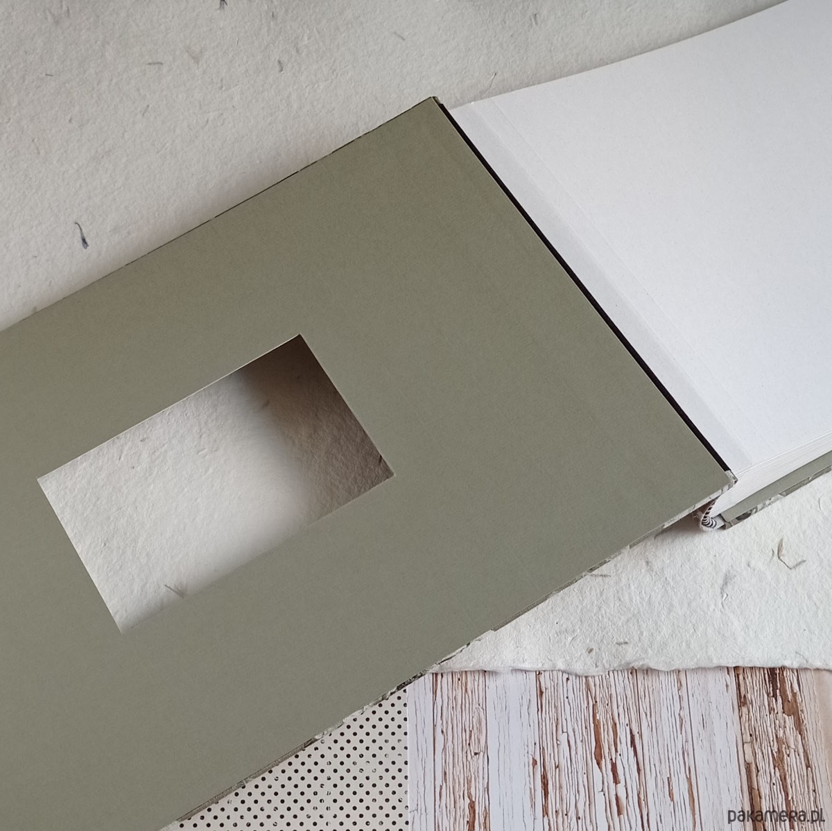 W przedniej okładce wycięte jest okienko przez które będzie widać pierwszą wklejoną fotografię.
