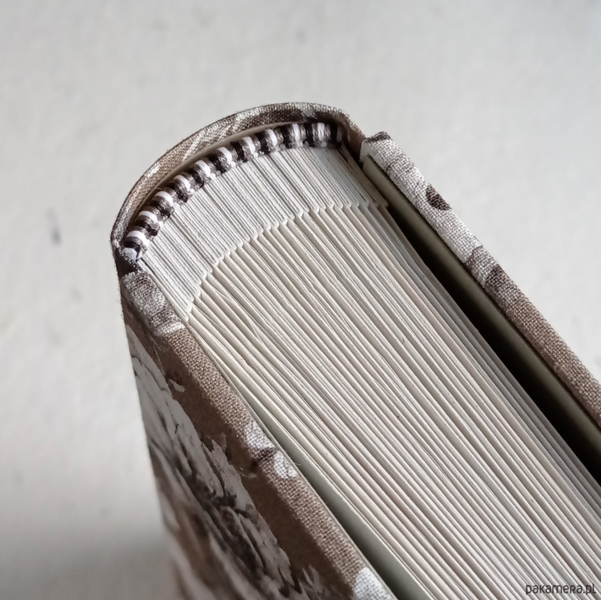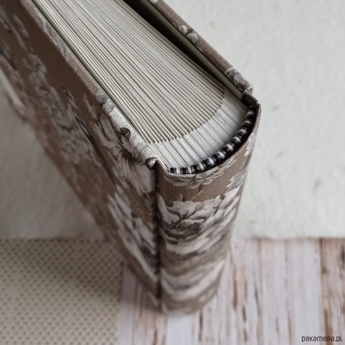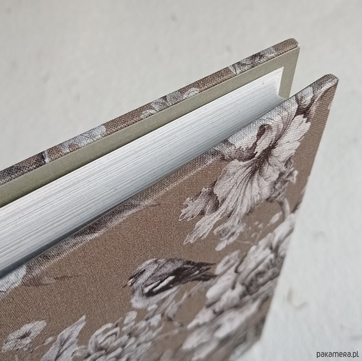 Okładka albumu oprawiona jest w bawełnianą drukowaną tkaninę, wewnętrzna strona okładki wyklejona jest żeberkowanym papierem barwionym w masie w odcieniu oliwkowym