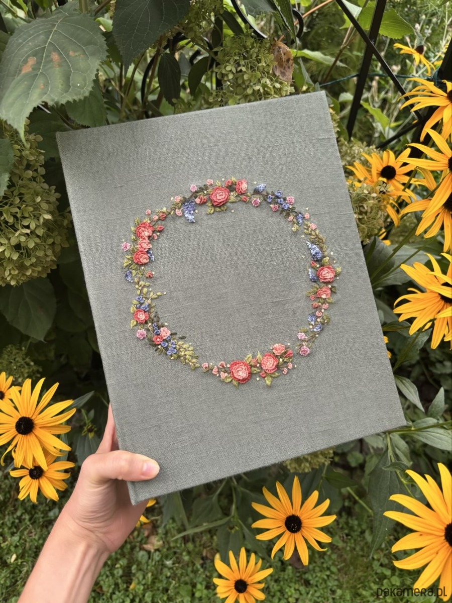Twarda okładka obłożona lnianą tkaniną z haftem - ręcznie wykonanym