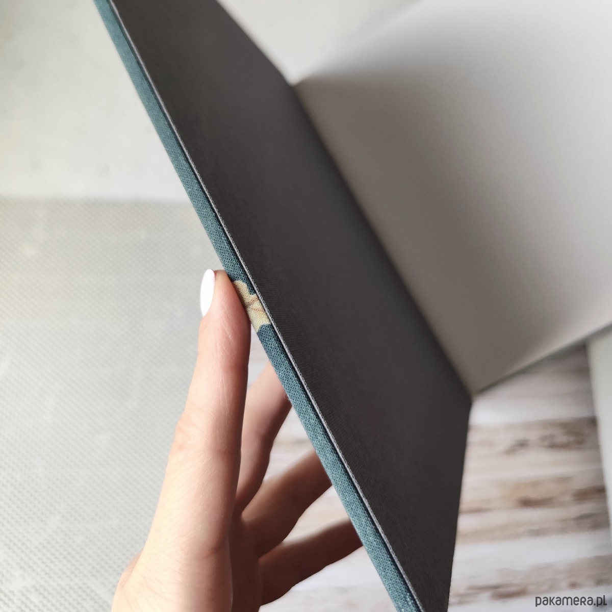 Wewnętrzna strona okładek wyklejona jest grafitowym płótnem,