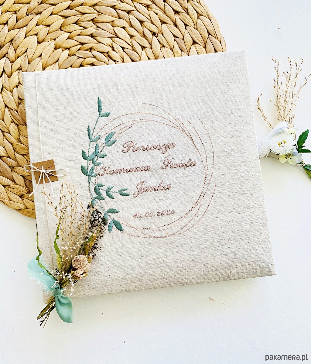Album wykonany z dbałością o każdy detal, oprawiony w naturalną tkaninę (len), z delikatnym haftem dopasowanym do okazji.