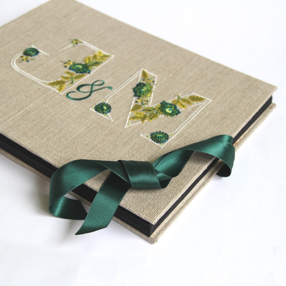 Album na zdjęcia wklejane, od podstaw wykonany ręcznie. Okładka obita płótnem lnianym, haftowane inicjały - po zakupie proszę o informację jakie litery mają się znaleźć na okładce i w jakiej kolorystyce. Wstążka może być dopasowana do koloru literek, zupełnie inna lub mogę wykonać album bez wstążki :)
