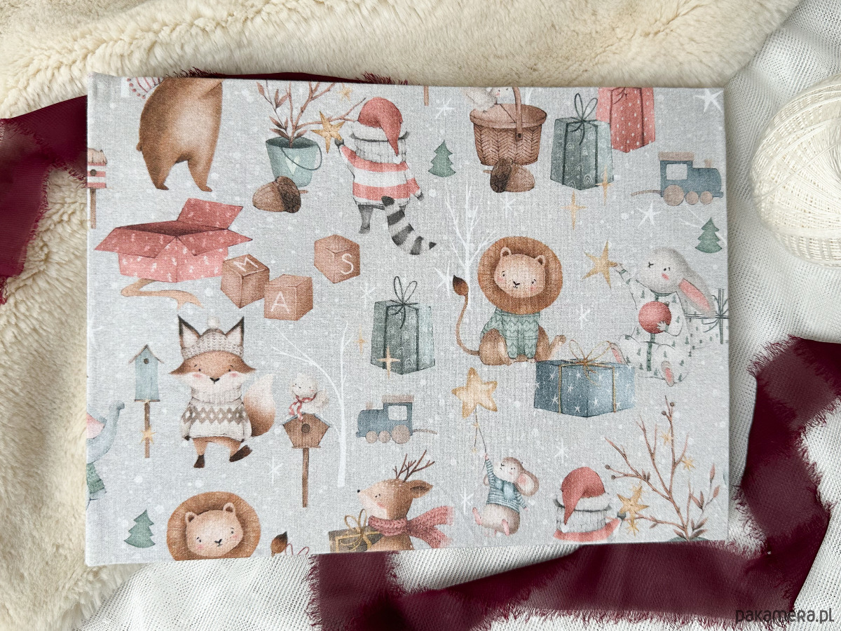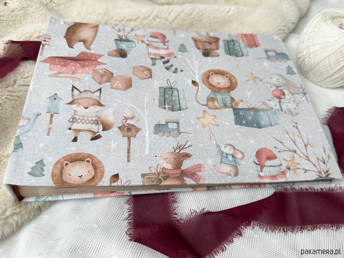 Album ręcznie robiony na zdjęcia wklejane, szyty - z motywem malutkich zwierząt w klimacie świąt. Zachowa fotografie, metryczki, odciski rączek oraz najważniejsze pierwsze chwile. Pomysł na czułą pamiątkę z dzieciństwa lub na prezent z okazji pierwszych wspólnych Świąt.
