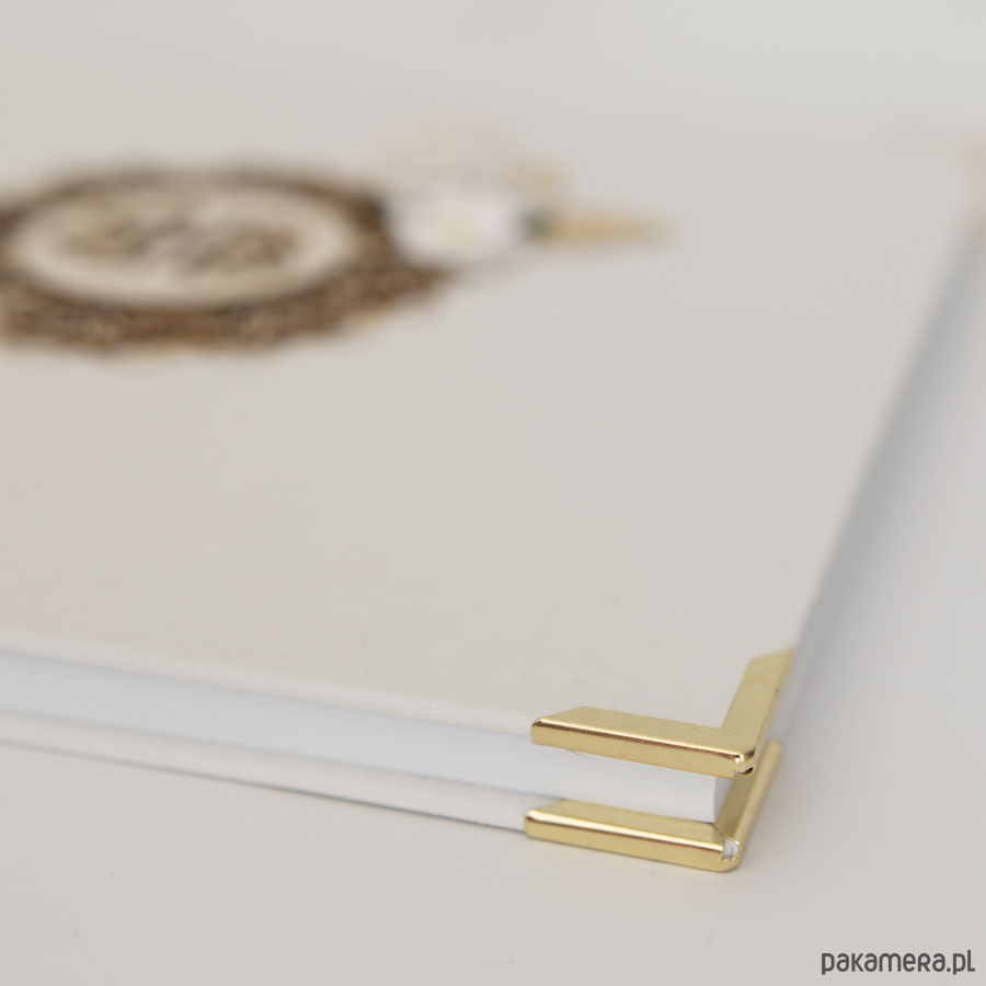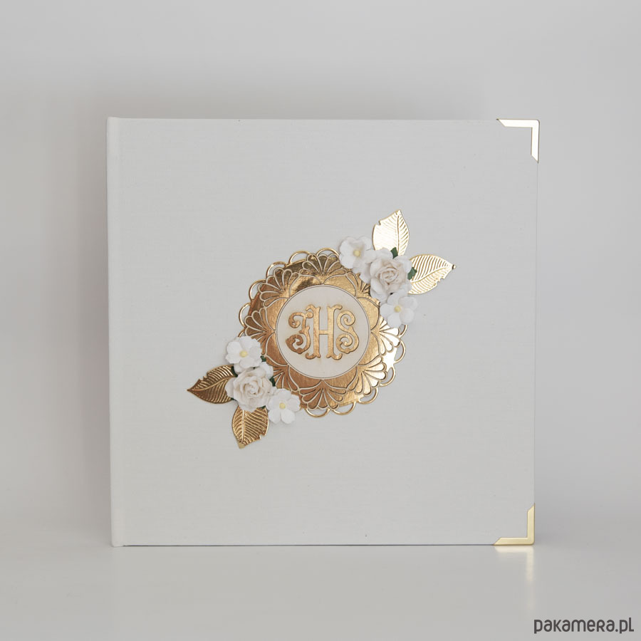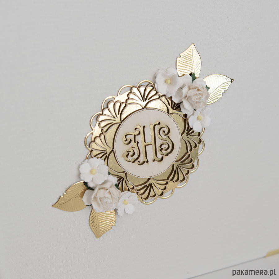 Twarda oprawa w białym kolorze, z przodu zdobienie przestrzenną hostią i papierowymi kwiatuszkami.